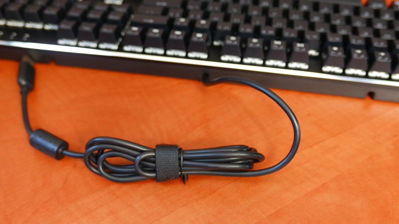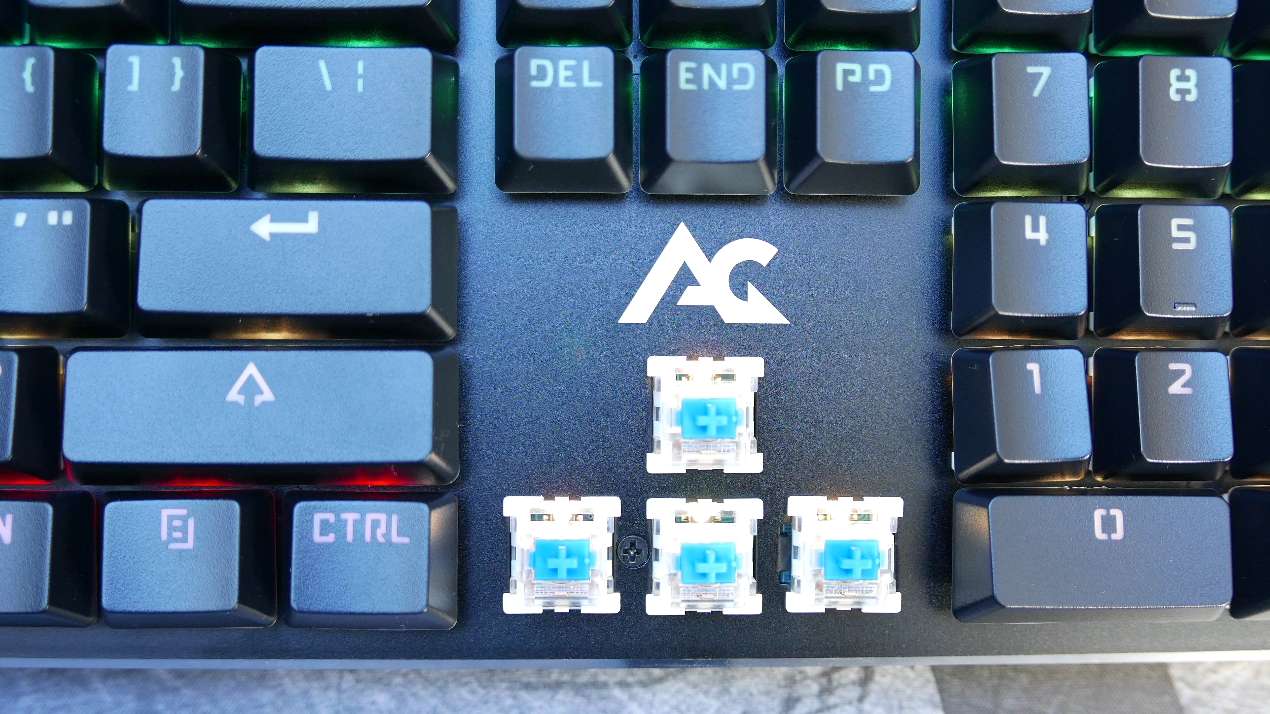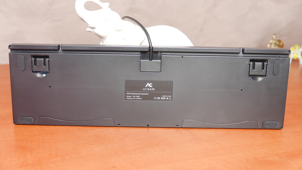 Pierwsze wrazenie po wypakowaniu klawiatury jak na sprzet budzetowy to musze wam powiedziec ze jest zaskakujaco dobrze. Mamy tutaj oczywiscie w sporej mierze lekko chropowaty plastik, ale z domieszka blyszczacego aluminium w ramie. Waga zatem tego urzadzenia to troszke ponad 900 gram, a po zaaplikowaniu nacisku na srodek ramy tylko lekko konstrukcja sie ugina. Co ciekawe calosc jest ze soba dobrze spasowana, tak wiec ciekawoscia idzmy dalej. Z tylu ACGAM’a znalazlo sie 6 przeciwposligowych elementow z czego 2 sa schowane w podwyzszajacych nozkach, warto jeszcze zwrocic tu uwage ze producent dal nam jeszcze kanal na kabel by tego nalezycie dopasowac do naszego stanowiska. Z tylu oczywiscie znalazl sie jedynie kabel USB, ten nie posiada oplotu jednak wydaje sie byc trwaly – tutaj jak zawsze szkoda ze klawiatura nie ma dodatkowego portu usb.