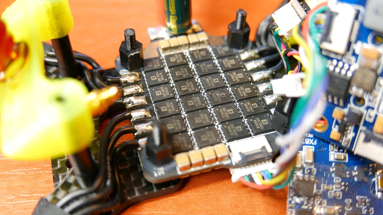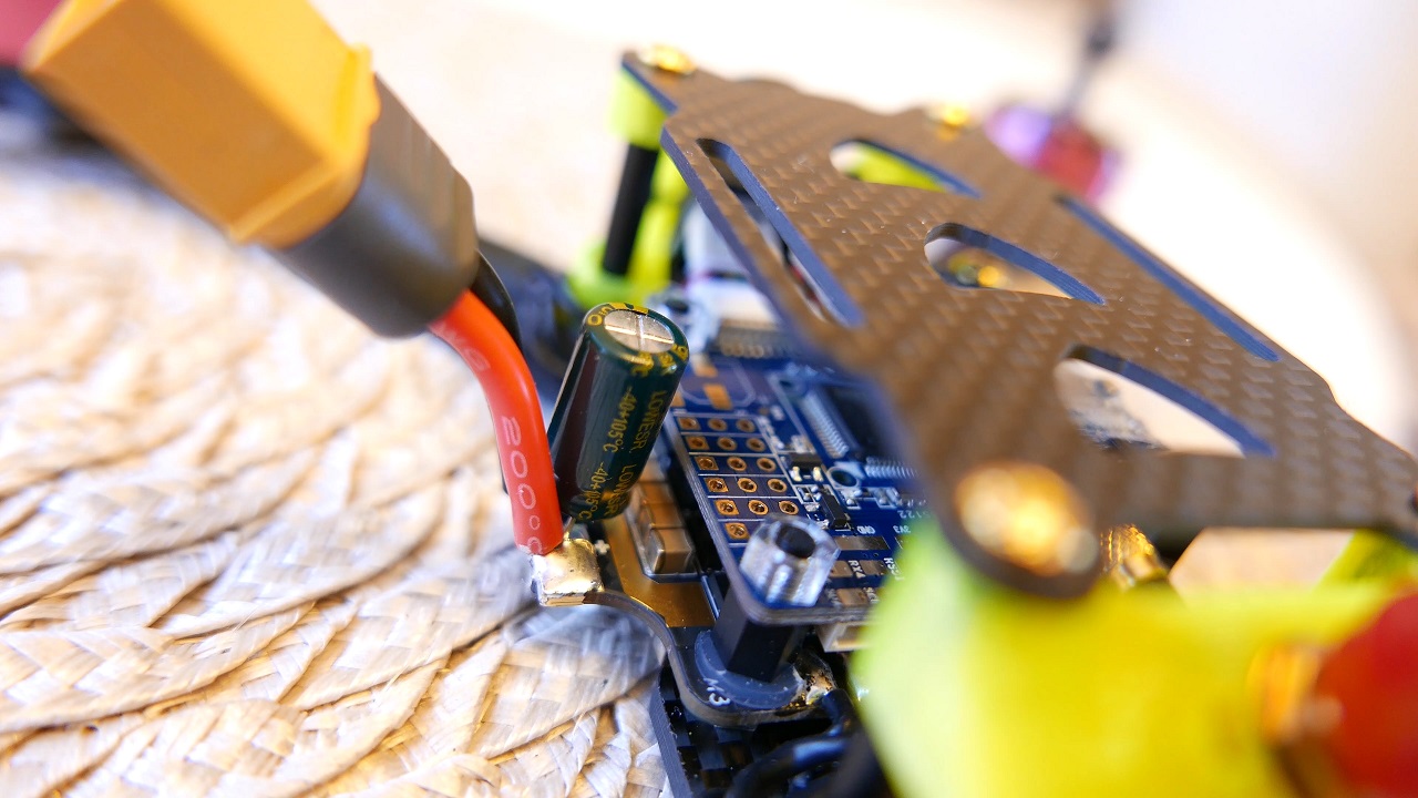 Airbot TD215 ma tez wlutowany kondensator i poczatkowo obawiałem sie że będzie to wygladało tak jak na zdjeciu, ale na szczescie jest duzo lepiej. Tutaj staralem sie go powyginać i zobaczyć czy jest odporny na przemieszczanie czy urwanie no i jest, wiec marne szanse by w jakiś sposob nam sie odczepił, ewentualnie mozna go jeszcze taśmą izolacyjną scalić z kablami od XT60 dla bezpieczeństwa.