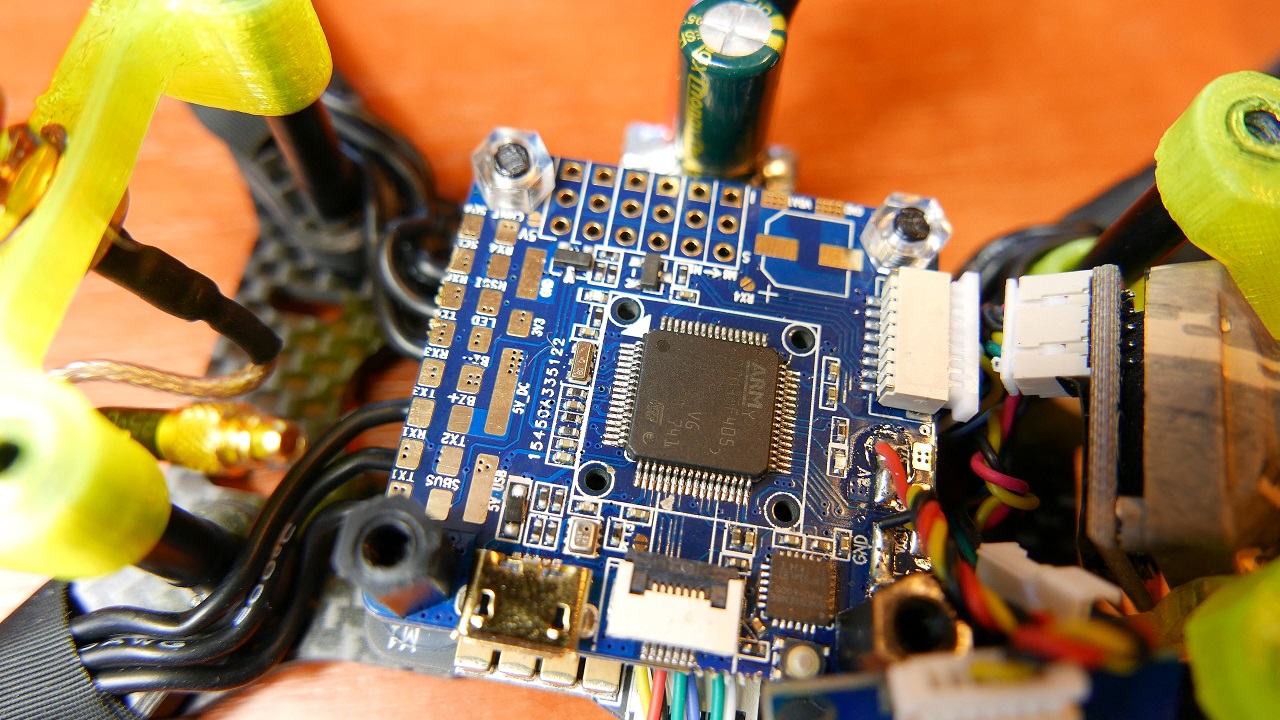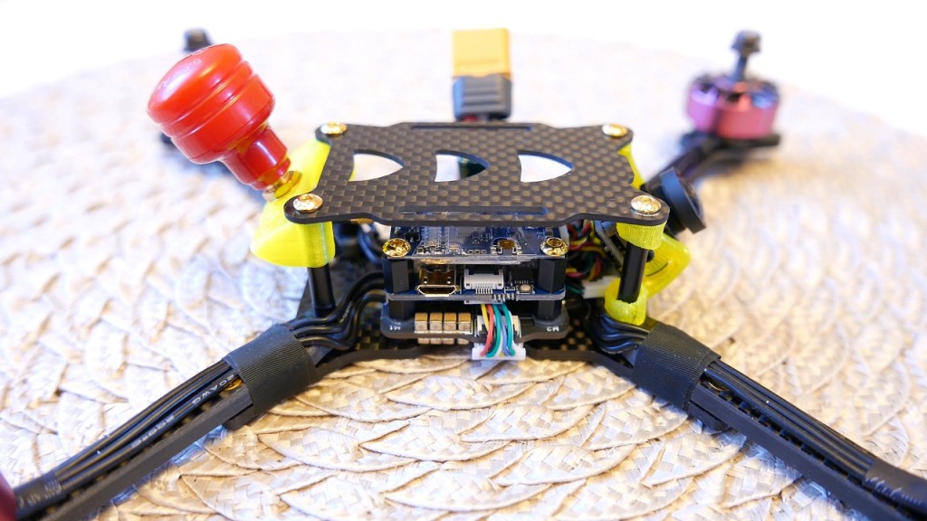 Pod spodem znalazł sie FC Airbot Omnibu F4 V6 czyli najnowsze dziecko tego producenta. Ta płyka kontroli lotu ma dosłownie wszystko, czyli barometer BMP280, żyroskop MPU6000, slot na karteSD, Dual Bec dla kamery, 5 Uartów czy konektor JST dla kompasu albo GSP’u. W opisie zostawiam wam link do szczegółowej specyfikacji, natomiast mnie ciekawi czemu producent nie dał zadnych gumowych nakładek by wibracje z komptera do tego FC nie dochodziły. O tym przekonamy sie juz niedlugo czy faktycznie nie ma potrzeby by souftmountów tutaj uzywać. Na samym dole mamy Airbota Typhoon32 V2.1 czyli jedno z najlepszych esc, o którym juz nie raz mówiłem na kanale, a nawet robiłem pełnego builda – dlatego odsyłam was po więcej informcji do tamtego filmu.