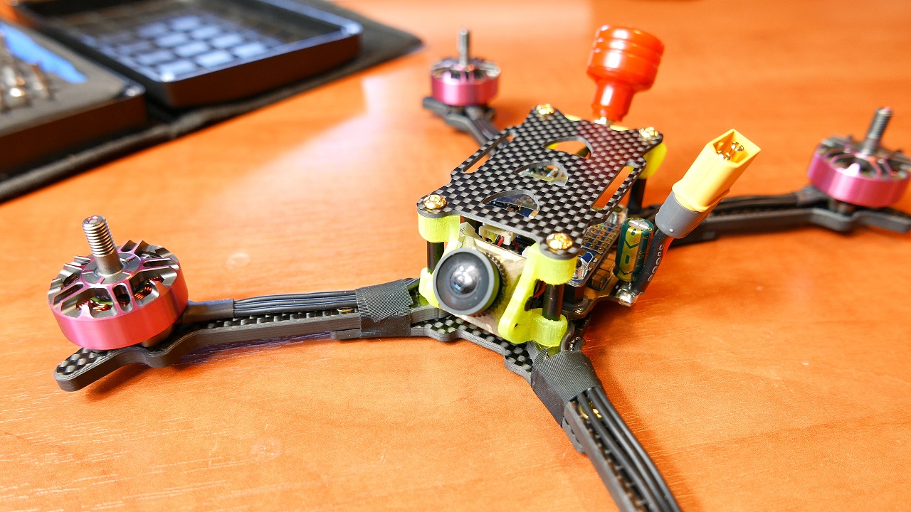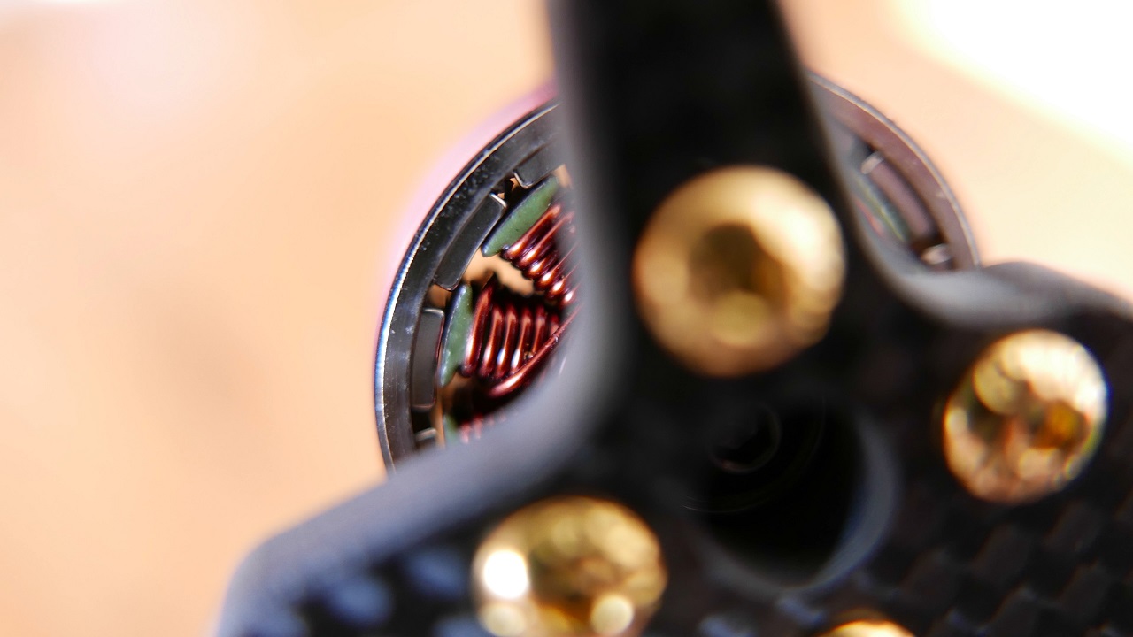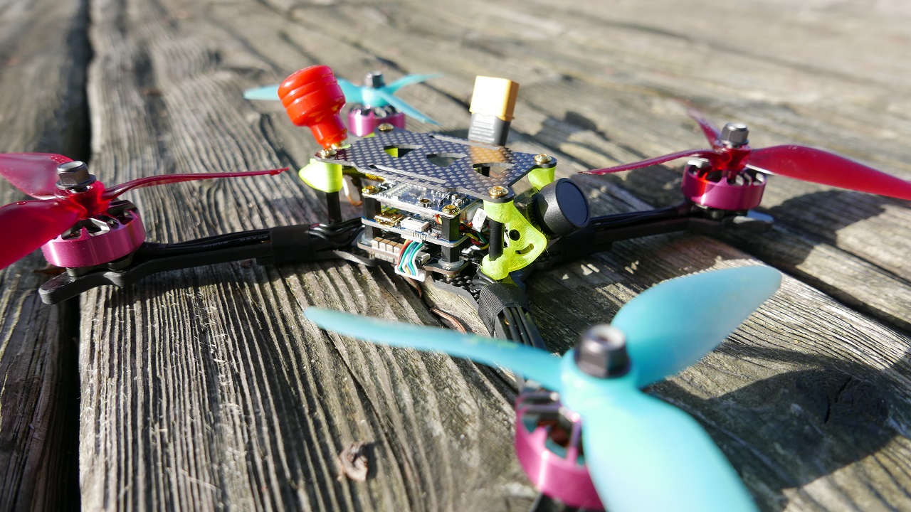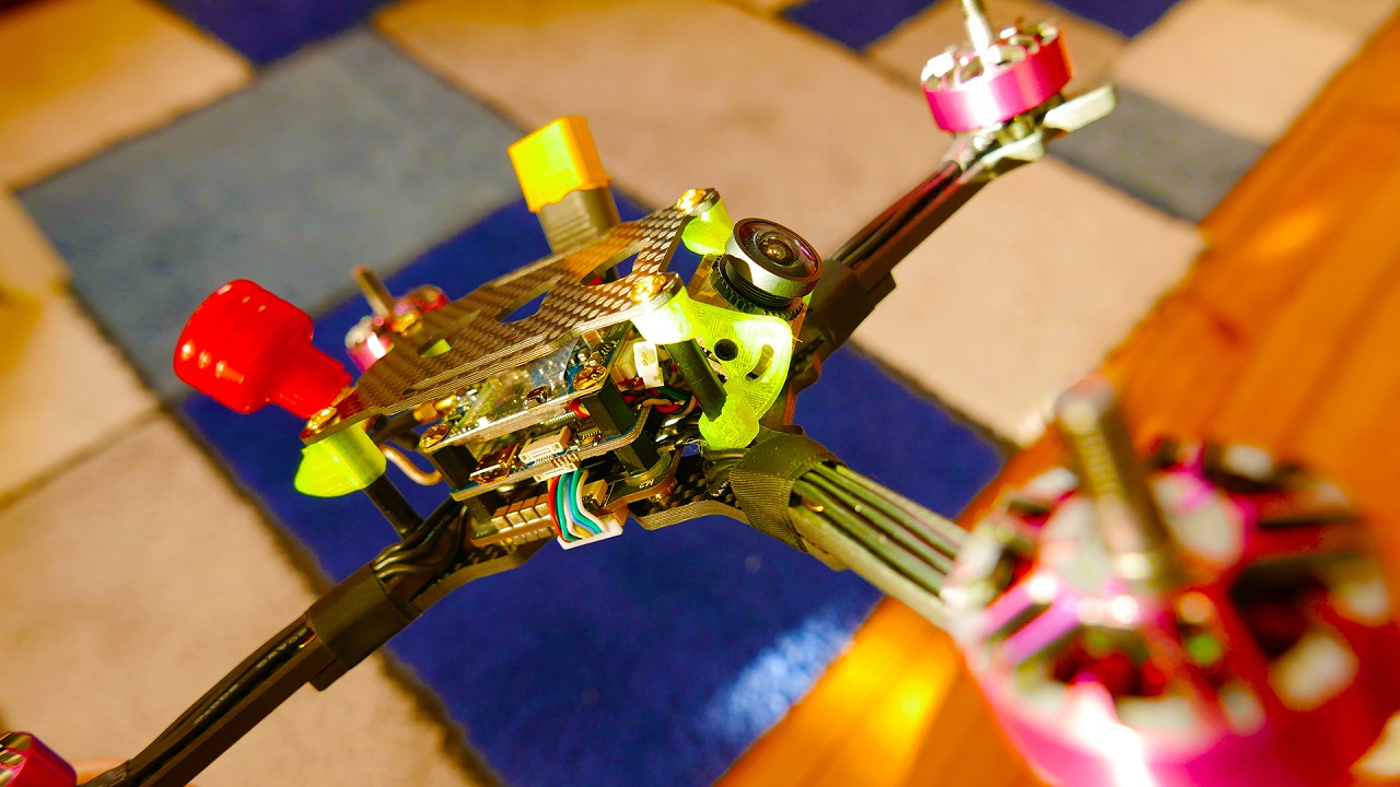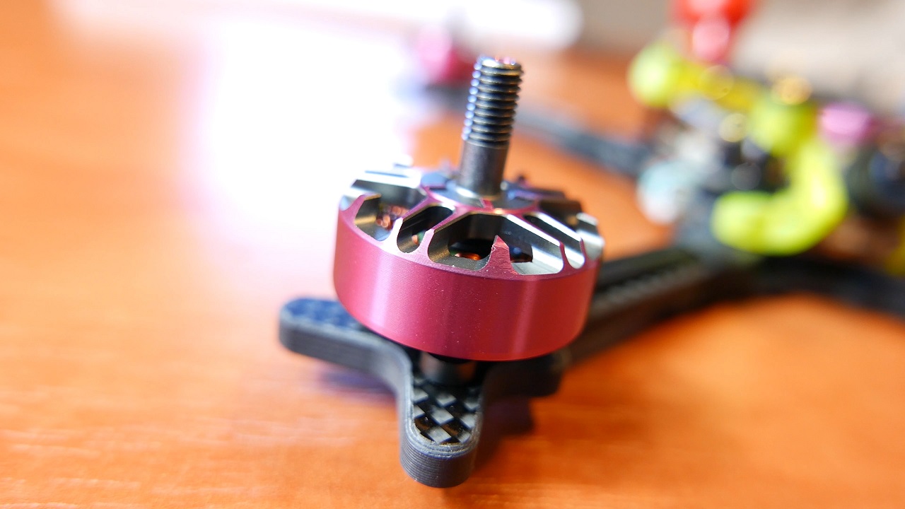 Tak zatem wyglada nasz dron od razu po wyjeciu z opakowania i pierwsze co poczujemy to jego ciezxar, wazy bowiem tylko 279g a wieć jest to waga lekka. Qwad jest tez bardzo zetelnie polutowany i poskrecany. Warto tez zwrocic uwage ze ma dwa wystające wydrukowane elementy na kamere i antene. Musza one tutaj jednak byc bo jak widzicie w srodku ramy nie ma miejsca na te rzeczy. Absolutna nowościa są natomiast same silniki, mamy tutaj bowiem Wild Willy’s Special Juice 2306 2700KV. Ostatnio nowym trendem jest wypuszczanie silników z ksywką znanych pilotów z branzy FPV i tym razem doczekał się ich Wild Willy, a w opisie zamieszczam jego kanał więc mozecie obczaic jego filmy. Wracając do silników, są one rażąco rózowe i co ciekawe nie mają zadnych oznaczeń po bokach. Podoba mi sie ich dizajn i to ze mają otwarty spód. Sczeliny miedzy magnesami a uzwojeniem sa doslownie na pol milimetra, a i czuc ze mamy tutaj na prawde silniki premium. Pomimo słonca, jest mi calkiem zimno wiec reszte opowiem wam juz w domu.