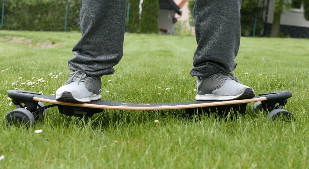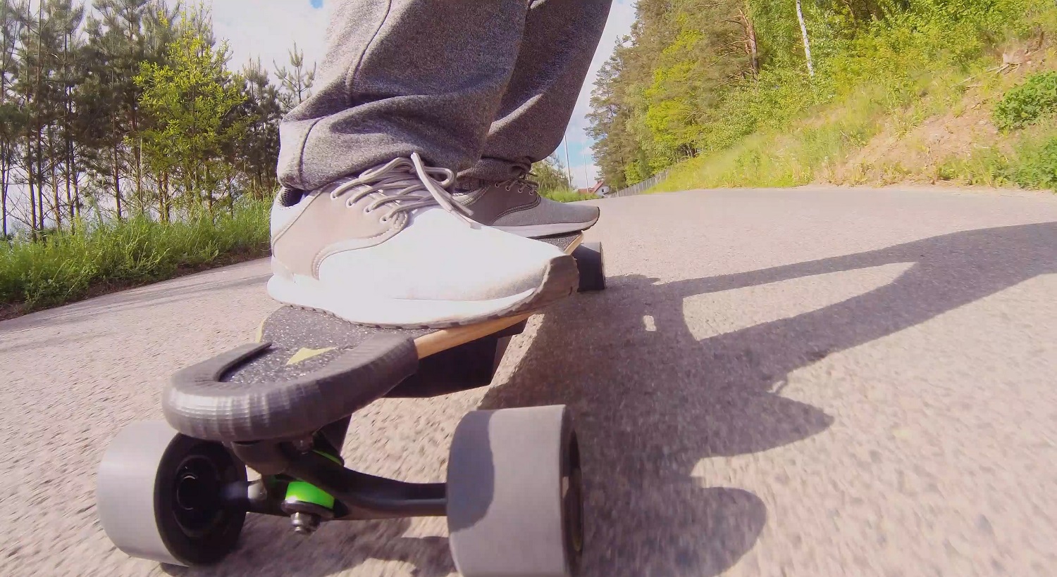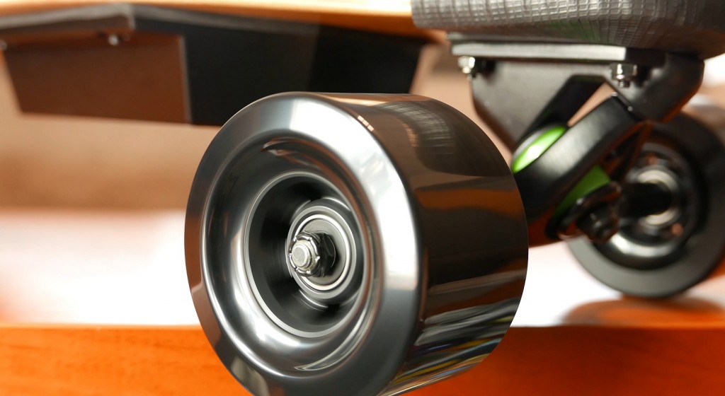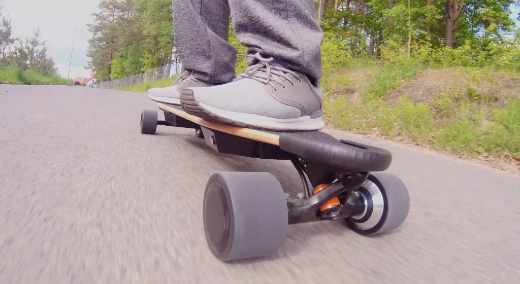 Jezeli chodzi o koła to są tu o szerokosci 90mm na 54mm, trucki wygladaja na na prawde porzadne aczkolwiek co to jest to nie mam pojecia, są stosowane w wielu chinskich deskorolkach. Jak zatem sprawddza sie w testach? Pierwsze co odczujemy gdy wsiadamy na taki sprzet to, to w jaki sposob hamuje czy przyspiesza. Tutaj jest to bardzo płynne, nic nie szarpie, nie ma jakichs przerwań – to jest bardzo istotna informacja bo o ile jeszcze przyspieszanie agresywne mozna polubic jak jestescie narwani, tak ostre hamowanie jest bardzo niebezpieczne bo deska sie zatrzyma w miejscu a wy wystrzelicie w kosmos. Tutaj na szczescie wszystko odbywa sie gładko i jak na profesionalny sprzet przystalo.