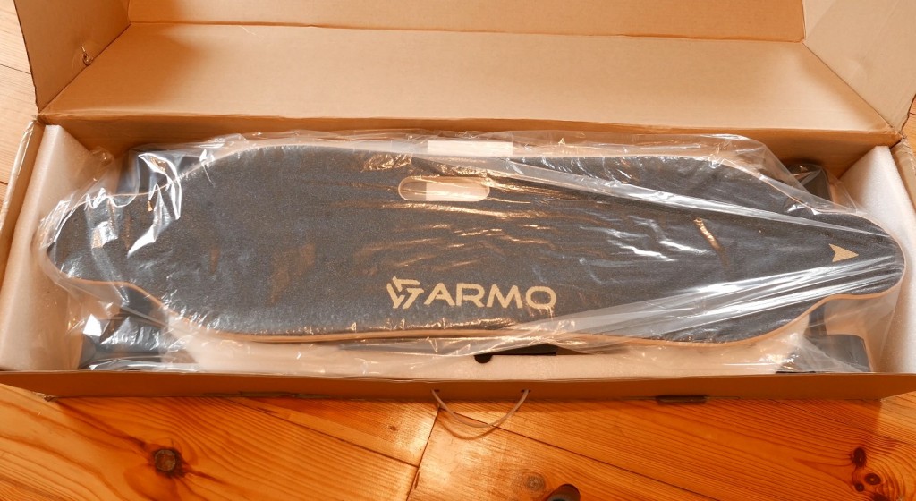 Deska przyszla w bardzo szczelnie zamknietej paczce, po otwarciu pudla widzimy ze Armo-Board jest dobrze zabezpieczony na czas transportu bo to co najcenniejsze okala miekka pianka. Poza głownym daniem otrzymujemy kolorową obszerna instrukcje oblusgi w jezyku angielskim, uniwersalny klucz do naszych tracków czy kół, mamy tez 2 amperowy zasilacz z mala lampka led bysmy wiedzieli czy deska jest juz naladowana, jest tez pilot o ktorym nieco pozniej wraz z kablem usb do jego ladowania, znalazlo sie tez kilka zapasowych srubek i dwa imbusy. Ciekawym natomiast dodatkiem są te dwie twarde gumy i szkoda ze wszyscy ich nie dodają do desek bo to napewno kiedys sie nam przyda – teraz nie bedziemy obijac z przodu i tylu decka, kolejną dość nietypową rzeczą jest dołączona ledowa lampka do roweru – ale i do deskorolki tez sie nada, fajnie że producent mysli o naszym bezpieczeństwie.