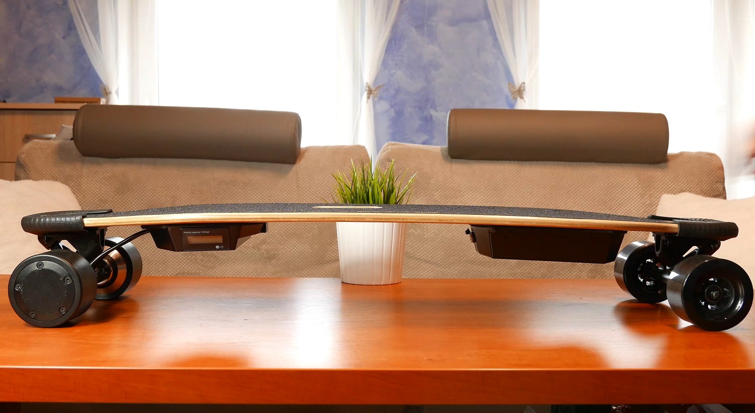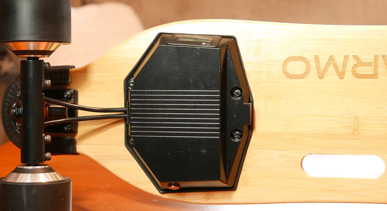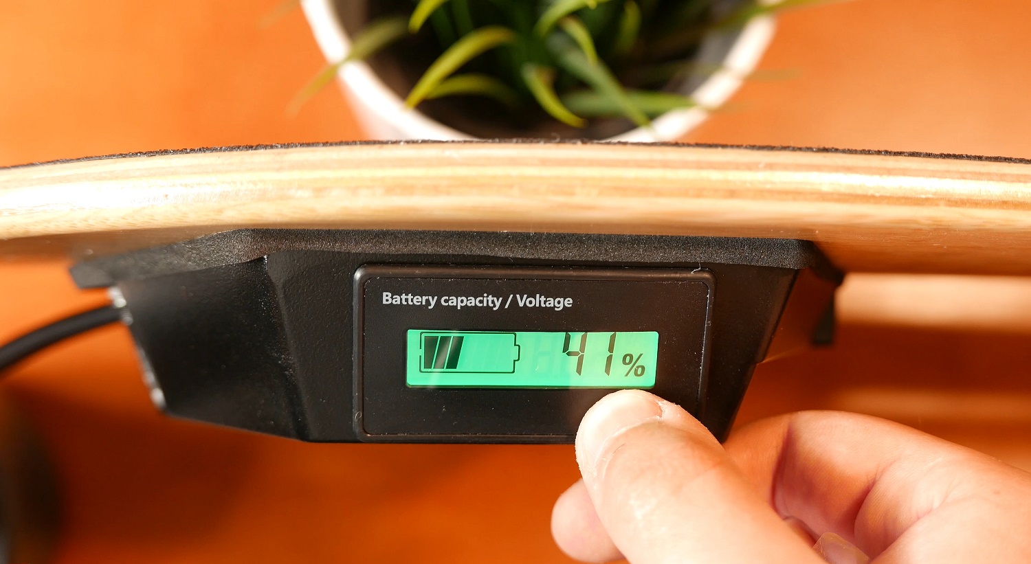 Sam deck przypomina mi styl boosted boarda i będąc szczerym troche szkoda, bo i tam i tu, nie mamy prawie wcale bocznnego profilu deski, a jak wiecie z poprzednich recenji ten troche nam dodaje pewnosci podczas jazdy. Ten deck wykonany jest z 7 warstw kanadysjkiego klonu i dwóch warst bambusa co daje nad calkiem dobra elastyczność. Z reszta zobaczcie sami jak konstrukcja ugina sie pod moim ciezarem. Pozytywnie zaskoczylo mnie to, ze pod spodem z tylu mamy maly wyswietlac który po nacisnieciu guzika pokazuje ile dokladnie mamy procent baterii, a po ponownym przyduszeniu guzika mamy dokladne volty. To dobra sprawa by wiedziec ile precyzyjnie posiada energii nasza bateria, a nie tylko miec zakres 1,2,3 czy 4 kreski na pilocie.