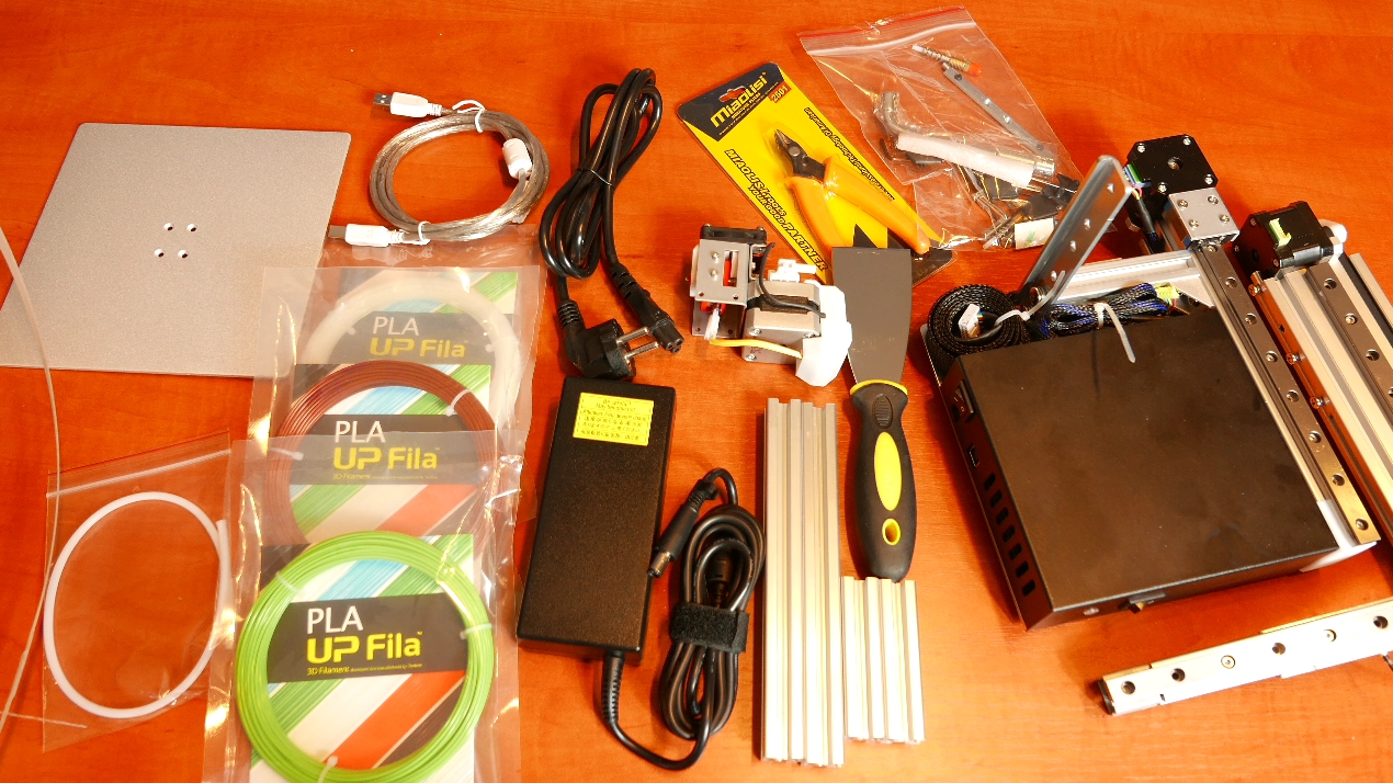 Maszyne zamowilem z oficjalnej strony producenta i z chin przyszla zaledwie w 3 dni, wiec jest to czas niemal nie do pobicia jezeli chodzi o transport. Nasza drukarka jest pakowana w zwykle kartonowe pudelko z ktorego raczej wiele sie nie dowiemy, po otwarciu go natomiast widzimy bardzo dobrze zabezpieczone elementy twardym styropianem. W srodku zas znajdziemy 3 rozne probki filamentu, mnie trafily sie kolory bialy, brazowy i zielony. Jest kabel USB do polaczenia drukarki z naszym Pctem jak i nie zabraklo dlugiego prawie 3.5metrowego zasilacza skladajacego sie z dwoch czesci. Mamy rowniez mala przezroczysta rurke by filament rowno wchodzil do dyszy jak i 4 metalowe elementy z ktorych zbudujemy podstawke dla naszych rolek z filemantem. Jest oczywiscie dysza, z zamontowaanym juz wentylatorem i silnikiem jak i metalowa szorstka plytka na ktorej bedziemy tworzyc nasze dziela. Producent tez dodal obcinaczke jak i szpachelke dzieki ktorej bedziemy mogli latwiej oderwac wydrukowane rzeczy. Są oczywiscie jeszcze srubki, odbojniki i inne akcesoria ktore moga sie pozniej przydac. Ostatnimi i najwazniejszymi elementami sa oczywiscie prowadnice osi Y I X z zamontowanymi silnikami i odpowiednio naciagnietymi paskami, jak i głowna baza.