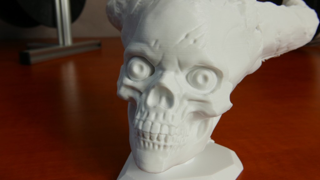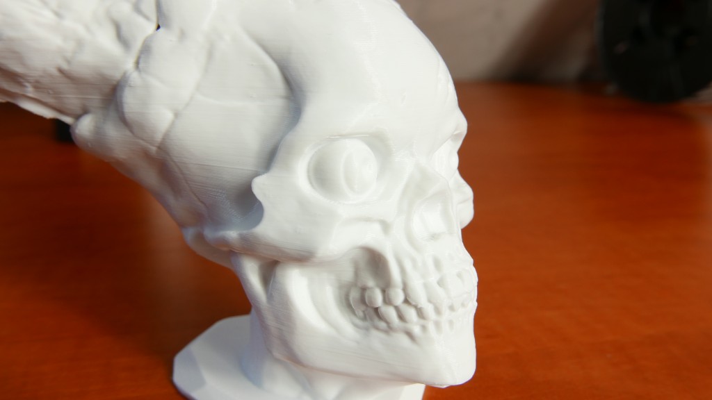 Na kolejny odstrzal poszla sówka. Zmniejszylem ja specjalnie do malych rozmiarow aby zobaczyc czy na wysoko detalicznym obiekcie drukarka nie zwariuje i nie stracimy tutaj po prostu na jakosci. O dziwo model wyszedl idealnie, plecy – mega gladkie, piora – widac kazde jedno, glowa ponownie – po prostu perfekt. Dostosowalem zatem w miare moiich mozliwosci po raz kolejny ustawienia do ostaniaj figurka ktora miala pokazac wszystkie wady i zalety tego sprzetu. Czacha drukowala sie blisko 13,5 godziny i wyszla tak. Generalnie z modelu jestem bardzo zadowolony, powstal on bez uzycia belek podpierajacych i dlatego jak spojrzycie pod spod zauwazycie niekiedy wiszace paski filamentu, w tych miejscach kont drukowania w powietrzu byl wiekszy niz 75 stopni i na tym nasz sprzet po prostu polegl, albo ja – bo jest jeszcze duze prawdopobienstwa ze przy innych ustawianich, albo nawet lepszym niz najtanszy na rynku filament Cetusowi MK2 po prostu i tu by sie udalo.