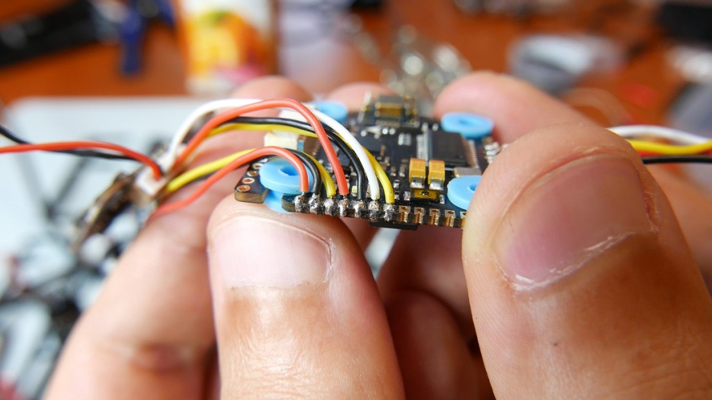 No i fajnie, poza kamera jeszcze 4 miejsca zalalem cyną, one odpowiadaja nam za komunikacje z naszych odbiornikiem od crossfajera. Jezeli pamietacie crossfire to system do dalekich lotow, na ktorym spokojnie mozemy leciec nawet 40km. Oczywiscie naszym maluchem nie bedziemy latac dalej niz 200m, ale tutaj musze miec pewnosc ze nawet jak bede za 8 wielkimi scianami nic mi nie przerwie sygnalu – a TBS to mi gwarantuje. Wracajac do FC zobaczcie sami, wszystko jest ladnie przygotowane, myslalem ze nie dam rady z tymi malymi padami ale o dziwo bez zadnego problemu.