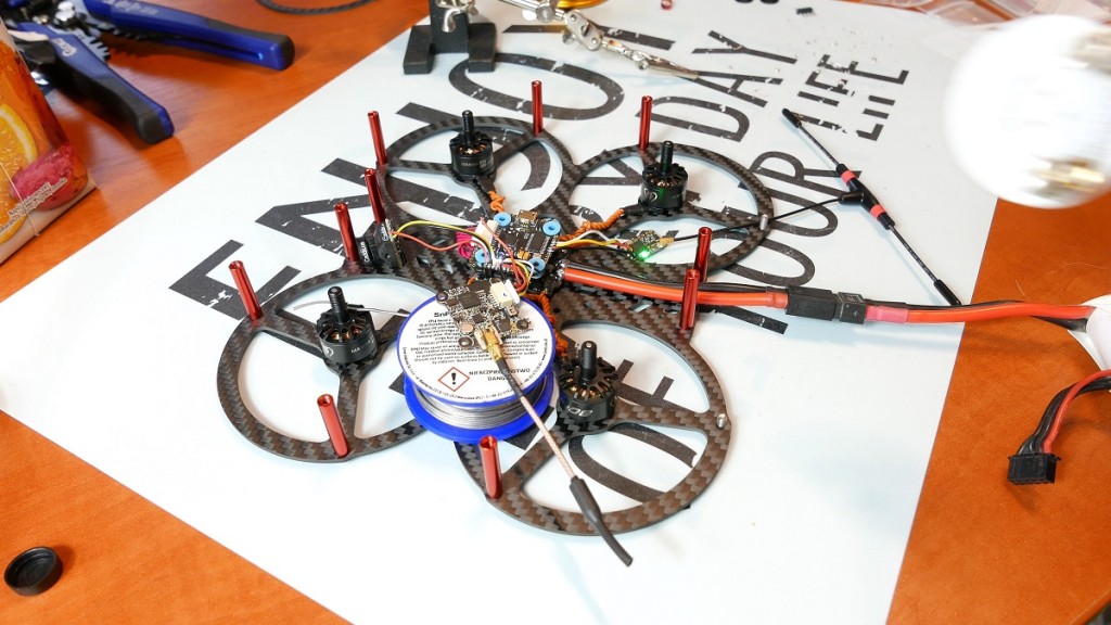 No i włala zobaczie jak to wyszlo, bo wyszlo idealnie. Musze jedynie zaznaczyc, ze jezeli nie macie wprawy w lutowaniu – zdecydowanie odradzam i nie uczcie sie lutowac na tej mambie. Dajcie ją komus kto mial juz w reku lutownice i cyne. Te pady sa na prawde male i po prostu bardzo latwo mozecie zrobic jakies zwarcie czy cos uszkodzić. Okej, ostatnia rzecza ktora musze zrobic to przylutowac kable od XT60, mam jeszcze dolaczony do zestawu kondesator – ale z ciekawosci jak radzi sobie filtrowanie nie bede go lutowal. No i dobra, chwila prawdy podlaczam pierwszy raz lipo i zobaczmy czy cos nie wybuchnie. Fantastycznie, melodyjka jest obraz w goglach jest tak wiec wszystko polaczlismy miloscia. Teraz zostaje mi jedynie calosc zamknac i ladnie poukladac w srodku bebechy.