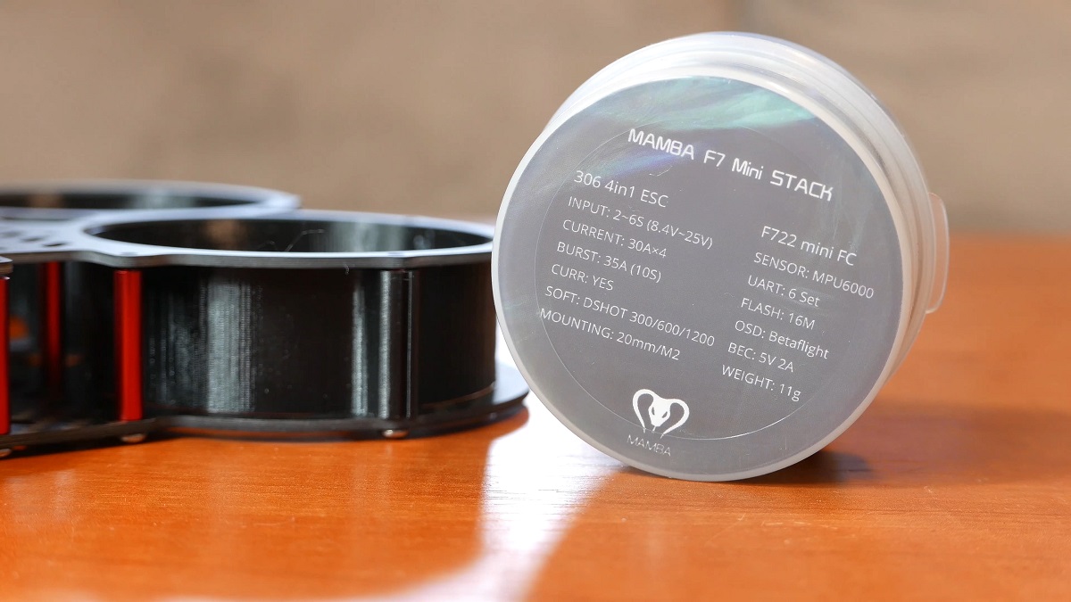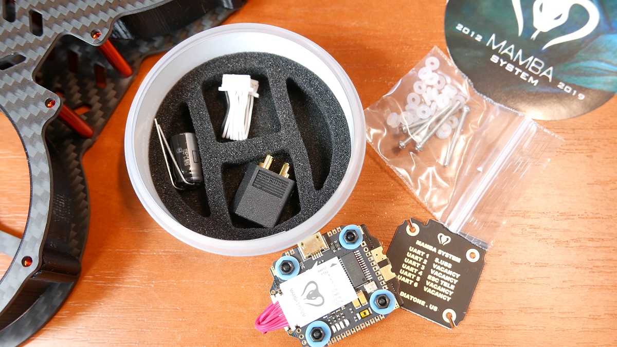 Idąc dalej mamy serce czyli wieża FC + ESC – Mamba F722 Mini. Te maleństwo jest napakowane najnowszymi bajerami jak procesor F7, ESC obsluguje Dshot1200, a w srodku dodatkowo jest 16mb pamieci do rejestracji wydazen w czarnej skrzynce. W poprzednim 7 odcinku z serii budowy drona uzyłem stacku 30×30 i pomimo ze jest to wiekszy brat i kopter latał na lekko gorszych parametrach na prawde dobrze, to juz nie moge sie doczekać jak będzie tutaj. W srodku tego pudelka macie konektor XT60, kondensator 35V 470uF + zapasowy kabelek laczacy wieze. Co ciekawe nie dostaniemy kabli AWG do XT60, ale jezeli juz budowaliscie wczesniej drona to na pewno gdzies je macie.