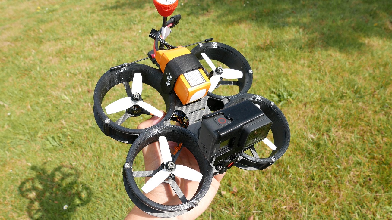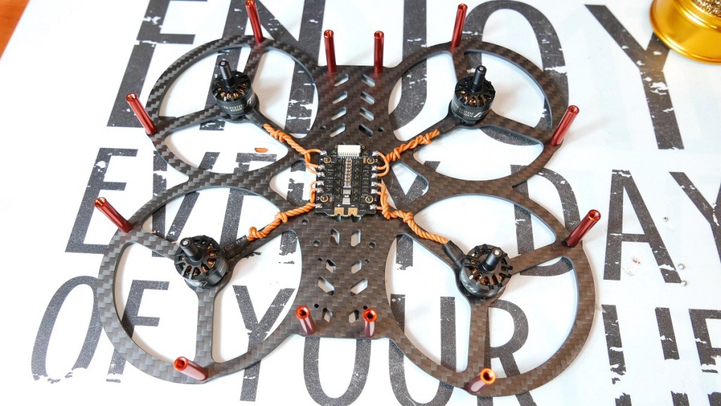 Kurcze, ten dron wyglada świetnie. Rama szwajcarów Cinematix to na prawde male dzieło sztuki, kosztuje okolo 300zł ale juz wiem czemu i zdecywowanie jest warta swojej ceny. Jedynie ma malą wade, poniewaz jak juz wszystko zalozycie to nie dostaniecie sie do portu USB mamby. Musicie kupic taką przejsciówke 90%, na szczescie ona kosztuje gorsze. Idąc dalej, ja calość bede zasilał bateriami 4S 850mAh od CNHL, są to na prawde bardzo dobre baterie. Latam na ich wiekszych odpowiednikach ponad rok i zlego slowa powiedziec o nich nie moge, jak za tą cene – lepszych nie znajdziecie. Ostatnia rzecza na ktora musze zwrocic uwage to smigla, jezeli zalozycie Ducty, czyli te oslonki bedziecie musieli skrocic smigla… o doslownie kawalek, ja uzylem do tego po prostu obcinacza do paznokci i wszystko jednakowo przycialem. Nie jest to wina tej ramy, a po prostu wszystkie konstrukcje zamkniete maja taką przypadlosc. Dobra dosc gadania i zobaczcie jak to lata.