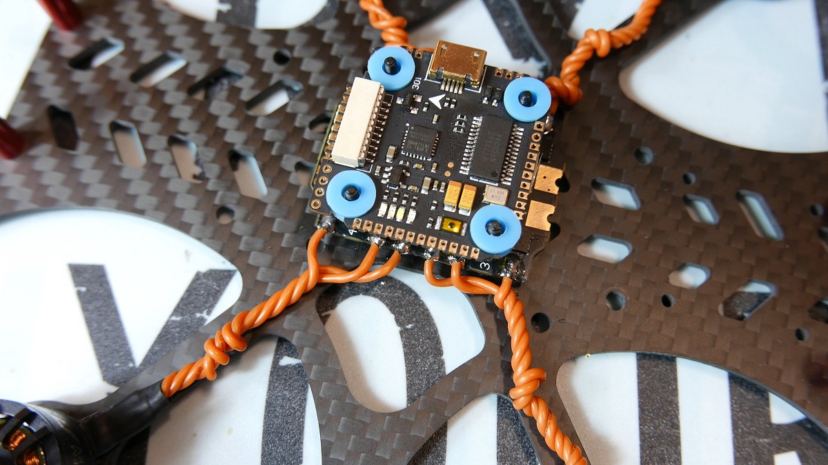 W porzadku, wszystkie pady przygotowane. Musialem skrocic dlugie kable od silnikow i teraz pozostaje nam je przlutowac. Pamietajcie, ze nie ma znaczenia ktory kabel do jakiego pada, bo i tak w Blheli ciag silnikow mozemy odwrócic jezeli ten będzie sie krecil nie w tą strone co potrzeba. Ja jak zawsze powtarzam, nie jestem mistrzem lutowania, ale tutaj musze wam powiedziec ze wyszlo na prawde swietnie. Luty sa idealne, nic nam sie nie styka wiec mozemy spokojnie przejsc dalej. Tak to teraz wyglada, troche za dlugie kable zrobilem tak wiec je poskrecalem, tutaj przyznam sie bez bicia ze gdybym je zrobil o centymetr krotsze troche by to estetyczniej wygladalo – ale to i tak wszystko bedzie niewidoczne wiec jest dobrze. Tak wyglada nasze FC z bliska i ja jeszcze stacku o wymiarach 20mm na 20mm nie mialem. Calosc jest bardzo mala i dobrze ze producent dorzucil taka plytke po prawej z oznaczeniem jaki pad do czego sluzy bo jak widzicie na to nie ma miejsca na plytce. No dobra, zgodnie z oznaczeniami producenta wiem ze nasza kamere i VTX’a trzeba przylutowac tutaj, tu musze sie skupic wiec milkne i przygotuje sobie pady.