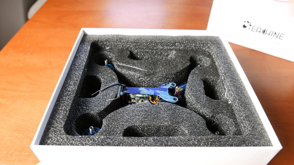 Z całego białego pudelka wiele sie nie dowiemy, na froncie jest jedynie logo producenta, a z boku mamy napisany dokladny model ktory kupilismy. Cieszy mnie ze wszystko w srodku jest dobrze zabezpieczone przed uszkodzeniami podczas transportow. Poza samym dronem dostajemy calkiem sporo, jest mała antenka. Dwie całkiem mocne opaski rzepowe z klamrą, komplet tryk tryków albo zipów które na polu skutecznie reperują jakies usterki. Jest taka gumowa tekstura ktora naklejamy od spodu drona by nasza bateria nie ocierala sie o karbon. Mamy pare zapasowych srubek. Swietnym dodatkiem jest tez miniaturka kałasznikowa wykonana z 5mm karbonu, gadzet ten mozemy sobie dodac np. do kluczy jako bryloczek. Idac jednak dalej mamy dwa takie 'klucze’ w cudzyslowie oczywiscie do odkrecania smigiel, są tez 4 gumowe pianki ktore przyczepiamy do ramion by nie ladowac bezposrednio karbonem na np. betonie. Ostatnia rzecza ktora dostajemy to dwa komplety smigiel Dalprop, sa to na prawde bardzo dobre smigla,a nie jakies krzaki wiec fajnie ze Eachine postawil tu na jakośc.