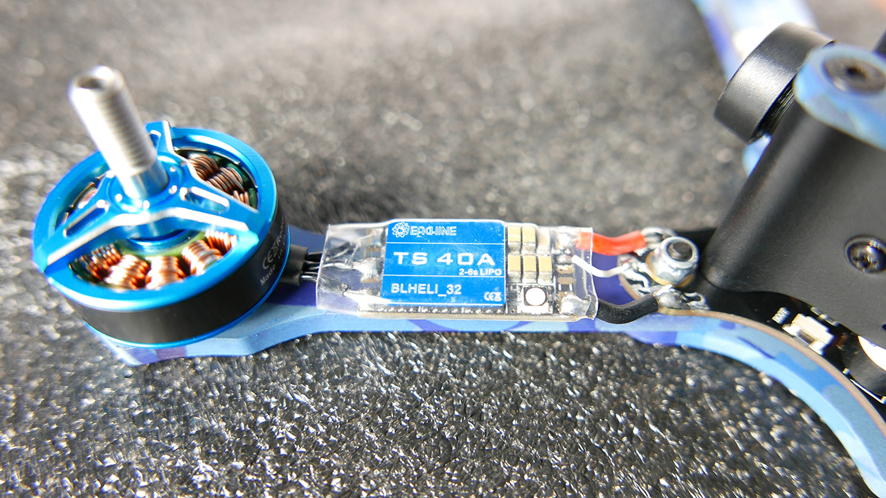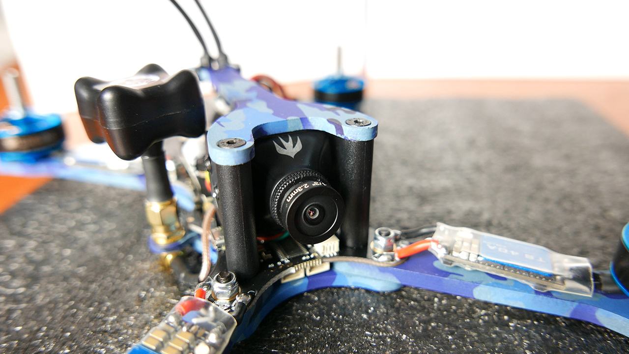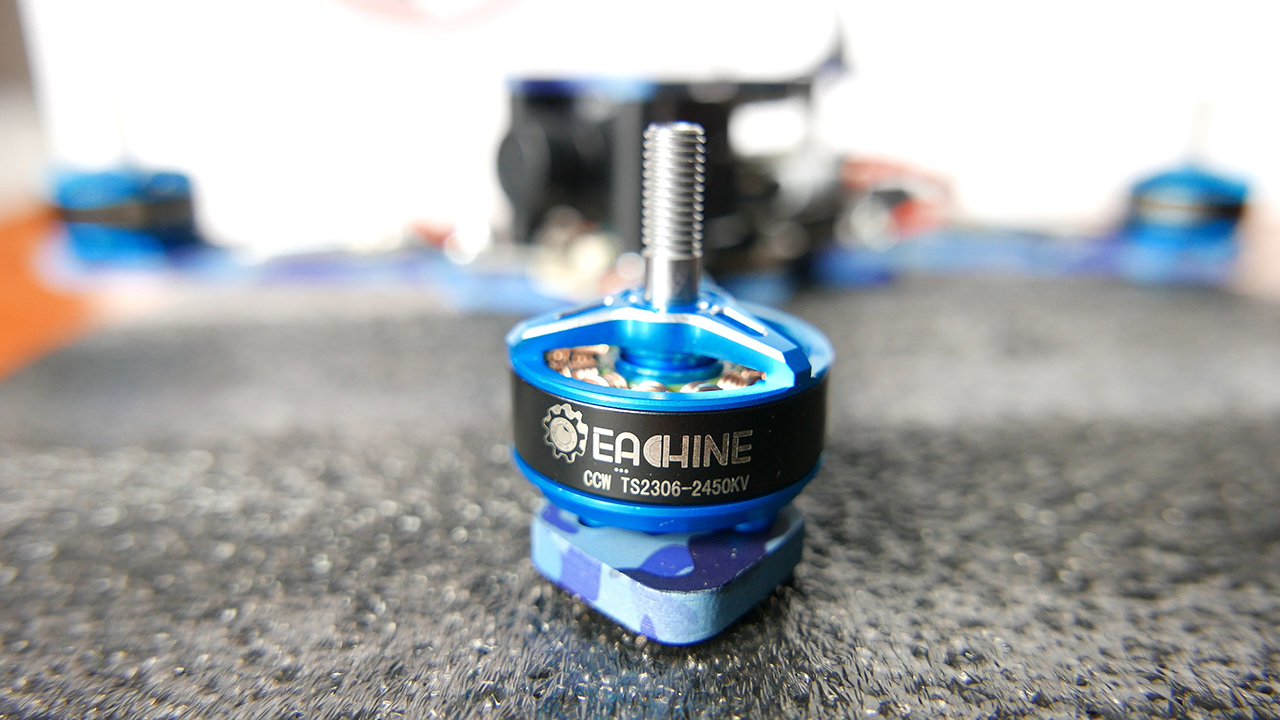 A co z jego specyfikacją techniczną? Tutaj jestem pod jej wrazeniem. Zacznijmy od kamery – mamy tutaj Runcam’a Swift’a 2 z sensorem Sony 1/3″, z bardzo dobrze dzialajacym WDR’em i rozdzielczoscia 600TVL a więc spokojnie wystarczającą do komfortowych lotów. Regle to Eachine TS40A te oblusguja najnowsze na dzien dzisiejsze protokoły jak Blheli_32, Dshoot1200 i 48Khz odswiezenie. Dodatkowo jak widzicie moga latac nawet z bateriami do 6s, tak więc jest to zdecydowanie górna półka. Pomimo jednak ze regulatory obrotów moga udzwignac baterie 6S to nasze FC niestety obluzy maxymalnie 5S, a więc i tak bardzo szybkie. Kontroler lotu to znany wszystkim Omnibus z procesorem F4, ale jak widzicie specjalnie dostosowany pod tą ramę. Eachine dodatkowo dał nam duze silniki o mocy 2450KV, a te nawet nie mieszcza sie i wychodza za obrys ramy. Juz teraz moge wam zdradzic ze dzialaja bardzo plynnie w powietrzu i zapewniaja ogrom mocy.