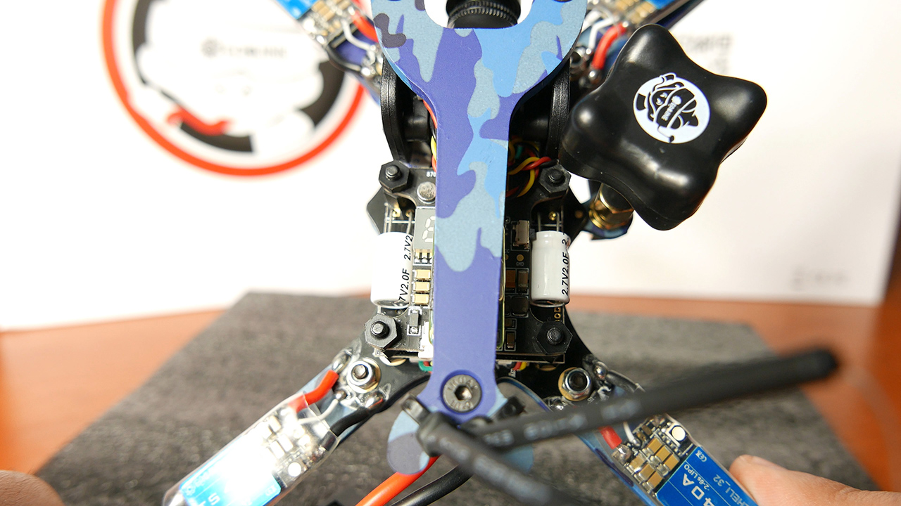 Ja mam wersje BNF czyli bind to fly z odbiornikiem radia FrSky czyli XM+ to na dzien dzisiejszy najlepszy maly odbiornik tej firmy, a jezeli nie macie aparatury FrSky to mozecie nawet zamowić tego drona razem z najnowszym budzetowym radiem Taranis’em X-Lite. Pod spodem znalazl sie VTX z mozliwoscia zmiany mocy od 25 do nawet 800mW, a wiec spokojnie wystarczy wam wizji do maxymalnego zasiegu XM+’a. W nadajniku jest tez smartaudio więc za pomocą OSD w goglach bedziecie mogli zmieniac jego parametry. Zwróccie dodatkowo uwage na dwa srednie kondensatory po bokach, one powinny zapewnic idealna filtracje zakłóceń generowana przez silniki co powinno skutowac bardzo dobra wizja bez liń w moich Skyzonach Sky03. Jednyną rzecza o ktorą bym sie obawiał w tej konstrukcji to w przypadku, wypadku o tą antenkę. Bowiem jak widzicie wystaje ona troche za gornego Top-Plate’a, a siła nacisku moze ja wgnieść na dół i połamac mocowanie na dole karbonu.