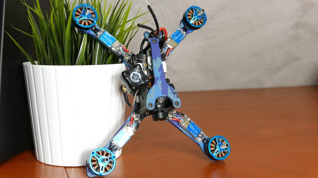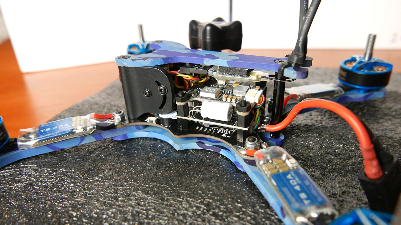 Dron po wyjeciu sprawie na prawde dobre wrazenie, ramiona skladaja sie z 4mm karbonu, a pozostałe uzyte włókna węglowe maja tutaj grubosc 3mm. Calość jest tez calkiem lekka 329g bez baterii to dobry wynik. Podoba mi sie tez tekstura takiego niebieskiego moro, ale to juz kwestia indywidualna. Jezeli chodzi o polutowanie calości jak i zlozenie to tutaj producent wykonał swietna robote, build jest czysty, a by samemu takiego wykonać to juz trzeba kilka dronow od podstaw zbudowac. Baterie na nim umieszczamy od spodu, na gorze bowiem jest jedynie miejsce na mała kamere typo session.