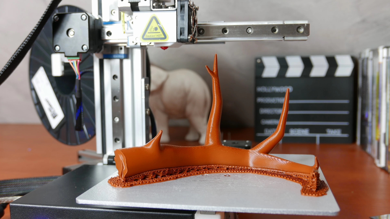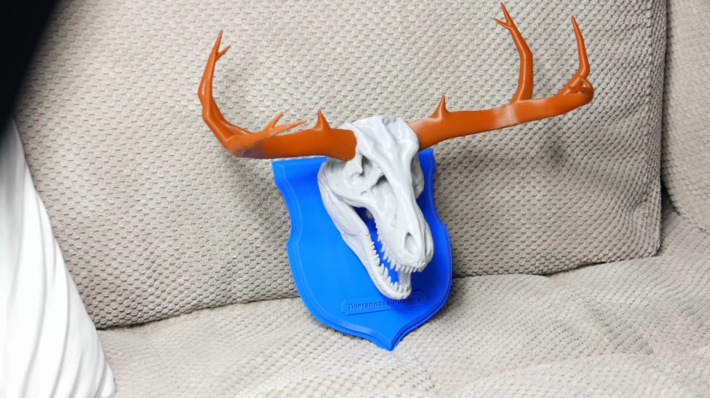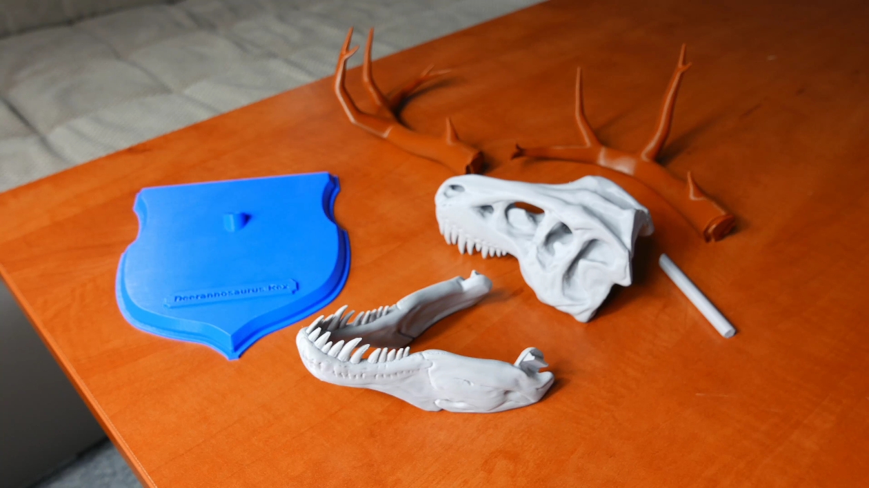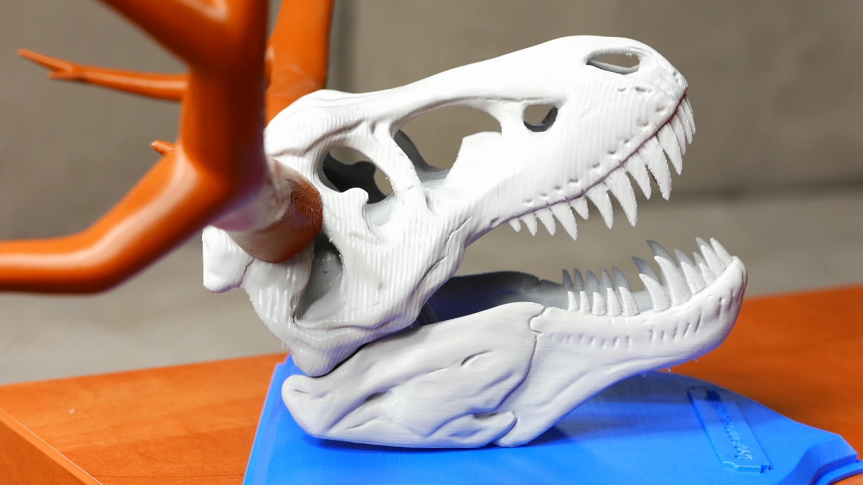 Zastanawialem sie chwile jak moge przetestowac ten filament i doszedlem do wniosku ze zamiast drukowac pospolite łódeczki i inne testery, wydrukuje cos bardziej praktycznego i czego faktycznie bede mogl uzyc jako ozdoby. Padło na głowę T-Rexa skladajaca sie z 5 czesci. Jednak po kolei. Na początek poszla podstawa do ktorej szkielet zostanie doczepiony, a ta dodatkowo posluzy jako mocowanie do sciany. Tutaj popelniłem jeden blad, a mianowicie ustawilem wsporniki ktore byly w ogole nie potrzebne, a konsekwencja tego jest to ze napis na dole w niektorych miejsach wyszedl nie idealnie bo tam musialem ulamywac wsporniki. Poza jednak tym incydentem jest mega zadowolony z druku. Na drugi strzal poszły rogi, tutaj niestety wsporniki byly niezbedne i od dolu jak zobaczycie beda takie lekkie przebarwienia od ich odrywania, to oczywiscie nie jest wina filamentu i na kazdym by to tak wygladalo na szcezscie takie wady latwo mozna zamaskowac uzywajac po prostu papieru sciernego. Poza jednak dolem ktory i tak bedzie malo widoczny ponownie nie mam kompletnie zadnych zastrzezen.