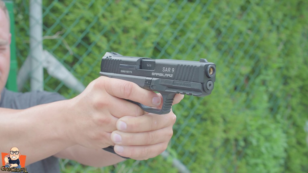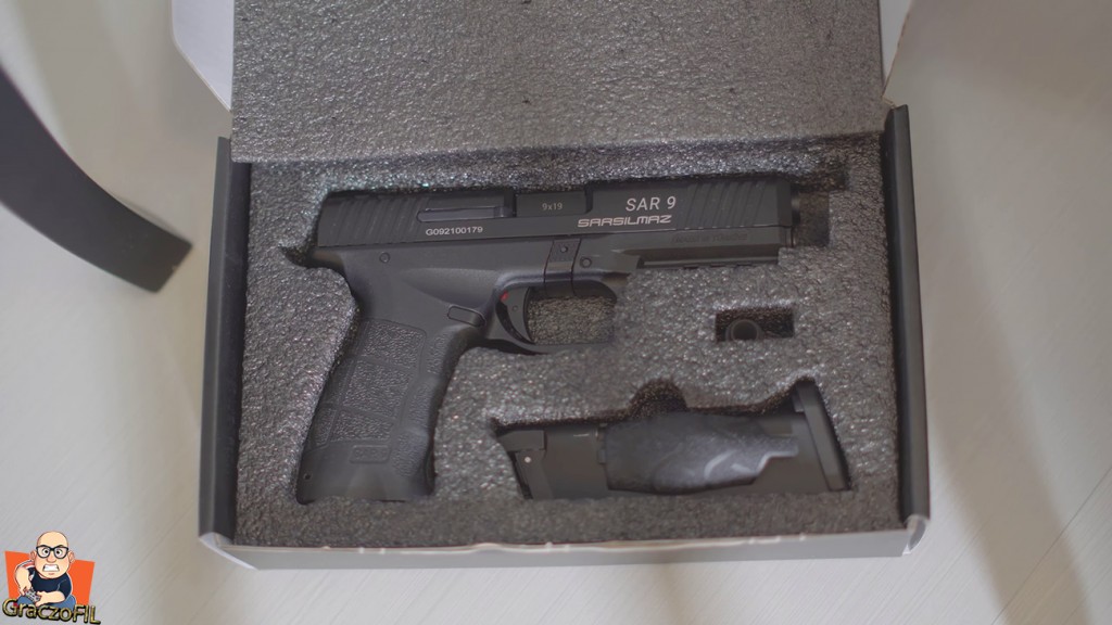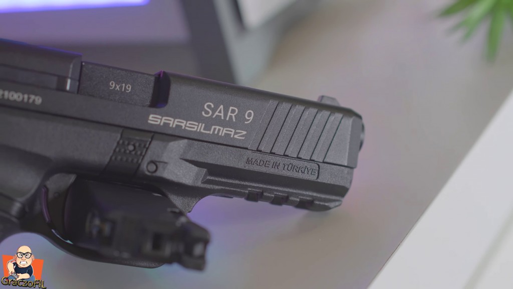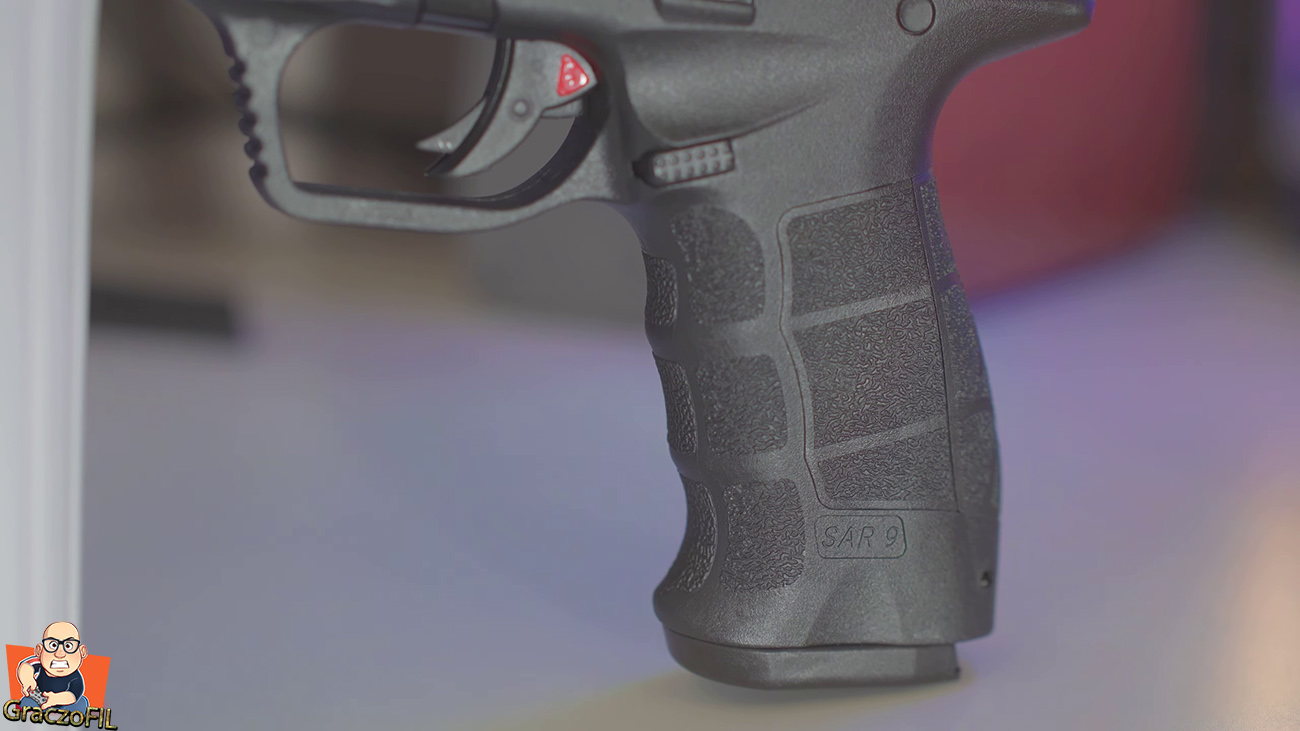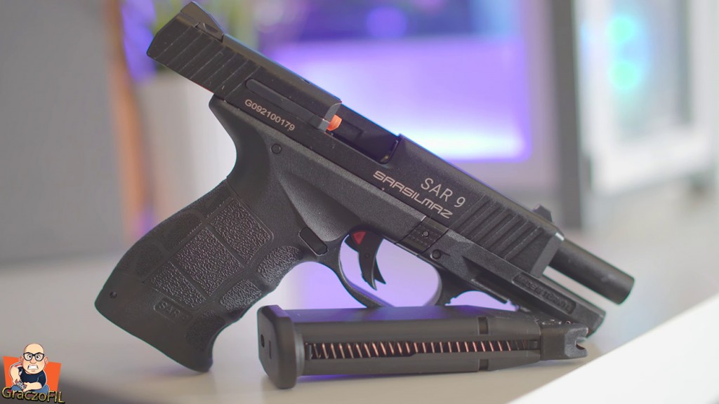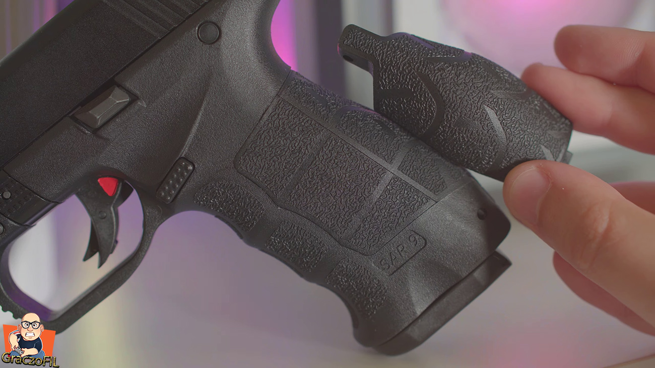 Tak wygląda sprzęt od razu po wyjęciu. Szkielet wykonany jest z twardego polimeru, zamek z aluminium, a całość wazy 750 gram. Generalnie w ręku czuć bardzo dobrą jakość, a spasowanie jest idealne… no poza jednym elementem – ale o nim w minusach. Chwyt oczywiście ergonomiczny i ma naniesiony taki chropowaty antypoślizgowy materiał, klamka leży w dłoni bardzo dobrze i pewnie. Świetnym patentem Sarsilmaz’a jest jego modułowość, jeżeli mamy wielką łapę możemy sobie zamienić lekko wypukły tył na bardziej. Malo tego, boki również sie zdejmują, ale te musimy sobie dokupić na własną rękę. Wymiana to prosta sprawa Wybijajmy 1 sprężysty kołek i juz. W górnej części rękojeści mamy przyciski zwalniający magazynek, super sprawa ze jeżeli jesteśmy leworęczni możemy go sobie przestawić na drugą stronę.
