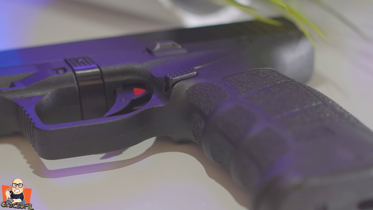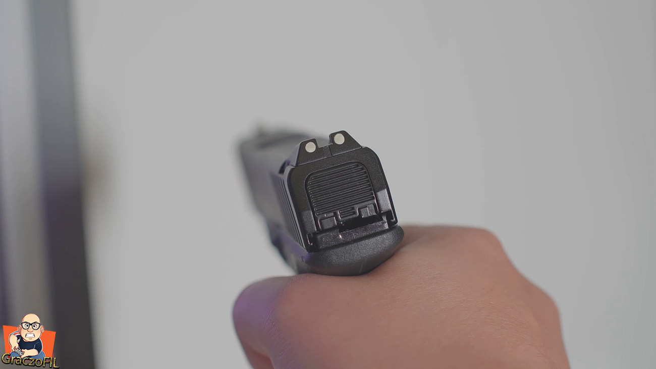 Lewa strona zamka bardzo minimalistyczna, z tylu i z przodu mamy przefrazowane pod kątem wcięcia ułatwiające chwyt podczas przeładowania, a na przodzie poniżej producent umieścił swoja nazwę. Ostatni przycisk to ten od zrzucania zamka, gdy owy zatrzyma się w tylnym położeniu po wystrzeleniu ostatniej kulki. Nie ma możliwości by tego przerzucić na druga stronę, jak było w przypadku tego guzika od magazynku. Po drugiej stronie mamy ponownie frezowania + nazwę modelu i producenta, W oknie wyrzutnika łusek wypalono oznaczenie kalibru, a z tyłu znalazł sie numer seryjny. Patrząc od góry są jedynie przyrządy celownicze czyli muszka i regulowana lewo/prawo szczerbinka. Super ze ICS pomalował je farba fluorescencyjna tak wiec jak tylko się ściemni, albo będzie kompletnie ciemno to i tak będziemy je widzieć bo będą lekko świeciły na zielony kolor.