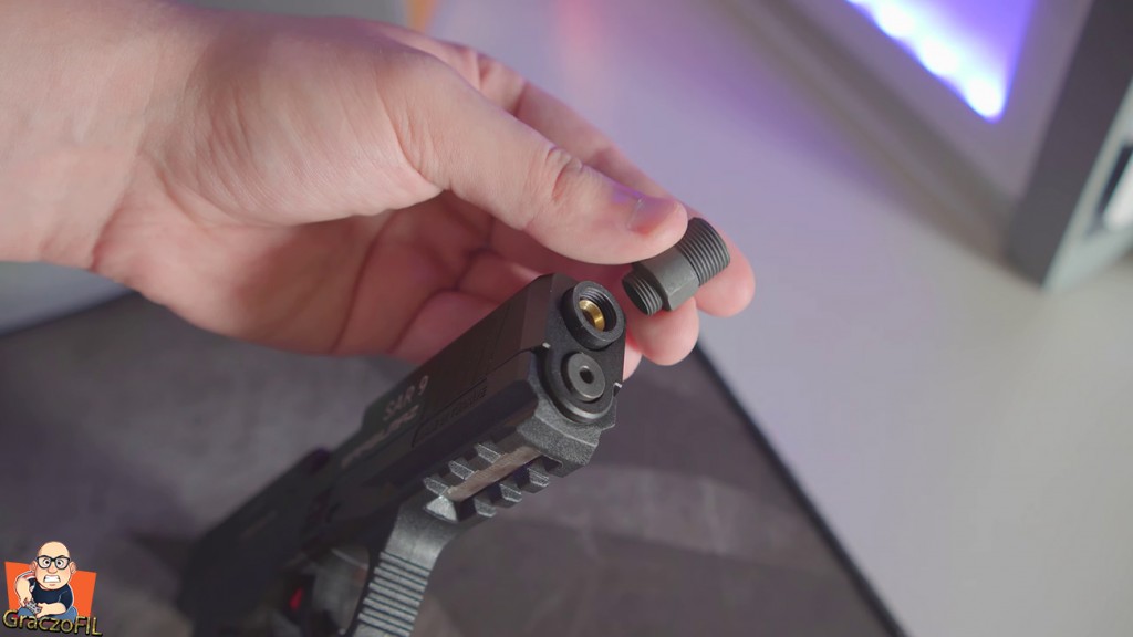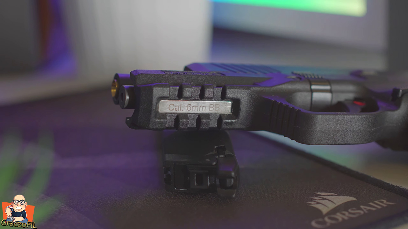 Cyngiel działa bardzo delikatnie, ma wyczuwalny reset i warto powiedzieć ze ma wbudowane zabezpieczenie. Jak w pełni widzimy czerwone oznaczenie to znaczy ze sprzęt jest gotowy do strzału. Oryginał i replika działa w trybie Single Action, wiec jeżeli nie mamy wpiętego magazynku z kulkami po oddaniu strzału cyngiel sie zablokuje, tak samo jak już skończą nam sie kulki. Pod lufą mamy szynę Picatinny z 3 slotami + napis „Cal. 6mm BB”. Ten jak i każdy inny jest wypalony laserem wiec marne szanse aby sie starł.