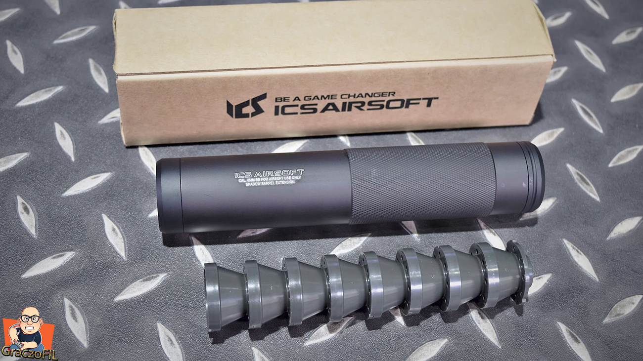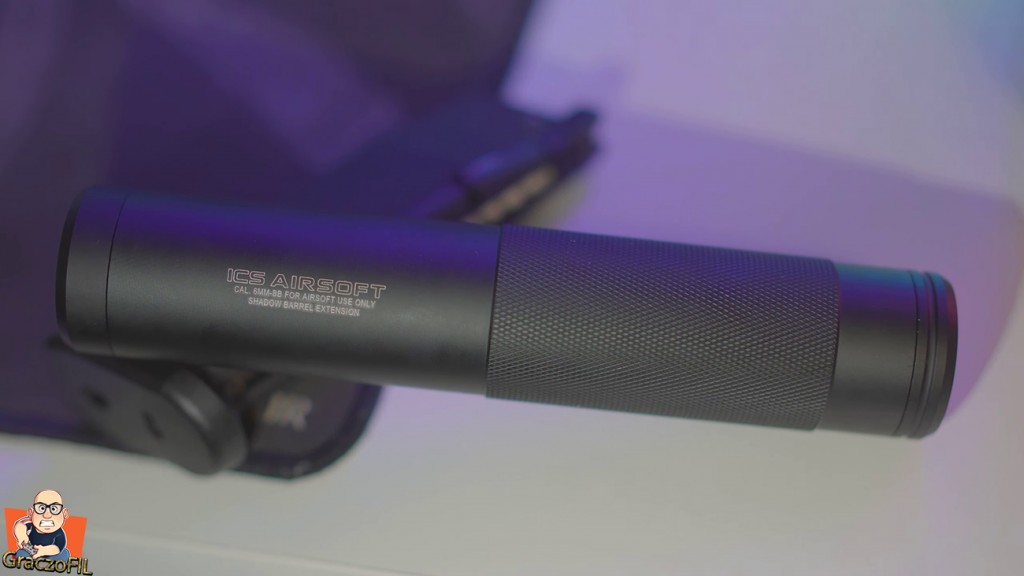 Sama lufa ma lewoskrętny 11mm gwint i tam podczepiamy to co wam na samym początku pokazałem. I tutaj bonus, bo ICS ma AC-04 czyli nic innego jak tłumik dźwięku. Tutaj producent przed moim zamówieniem wspomniał ze ich tłumik ma tzw. shadow capy czyli elementy faktycznie tłumiące dźwięk. I tu ciekawostka bo w niektórych krajach są one zakazane. Ja mam 160mm wersje, ale jest jeszcze 10cm – każda wykonana z metalu i na prawdę porządnie. Mamy również dodatkową texture do lepszego chwytu podczas przykręcania. Nad spustem po dwóch stronach mamy taka malutką dźwigienkę w kształcie litery U z wypustkami do lepszego chwytu. Pociągając ja dosłownie milimetr w dół, przysuwając potem zamek do siebie a potem zsuwając do przodu zdejmujemy ten element. Oczywiście ta sztuka uda się tylko jak będziemy mieli magazynek wyjęty.
