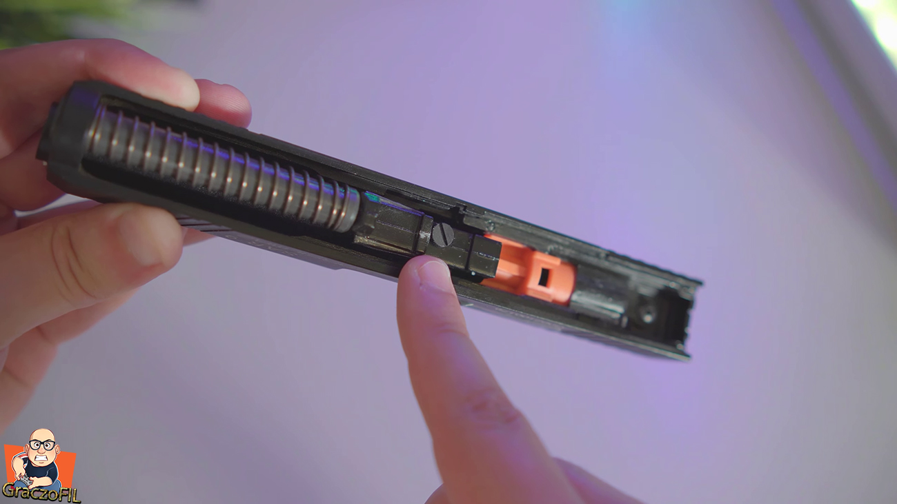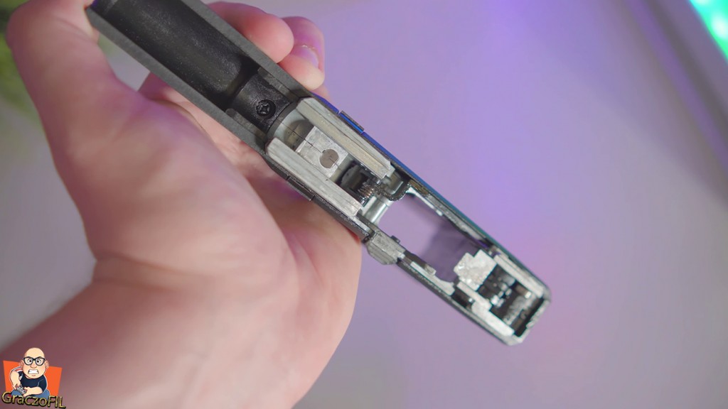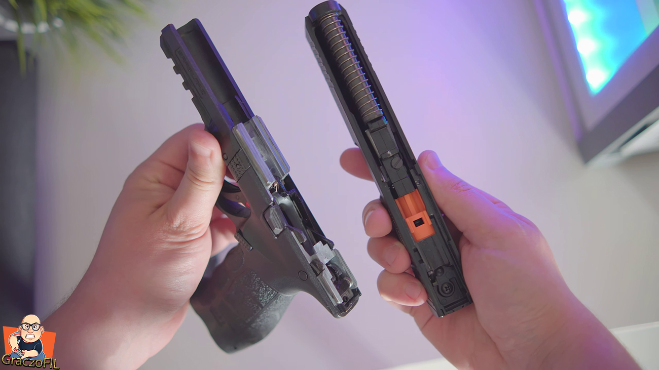 Tak jak w większości replik pistoletów tak i tu dopiero teraz możemy sobie wyregulować system Hop-up, zdaje sobie sprawę ze to trochę uciążliwe bo przy każdym strzale trzeba zdejmować zamek, ale na szczęście to trwa dosłownie sekundy . Sama regulacja czy to paznokciem bądź śrubokrętem dział płynnie, nie skokowo, zatem można szybko dostosować go wedle swojego uznania. Genialnym rozwiązaniem uraczył nas ICS jeżeli chodzi o złotą lufę wewnętrzną. Bo cała komora Hopka łączy się z szkieletem i w takim wypadku komora i lufa jest ciągle w takiej samej pozycji, nie ma żadnych luzów dzięki czemu celność jak i powtarzalność strzałów będzie stała na naprawdę dobrym poziomie. Jak widzieliście by dostać się do lufy zewnętrznej musiałem zdjąć tą taką luźna nakładkę która naśladuje przekąszanie podczas przeładowania po strzale. I do niej mam jedyne zastrzeżenie odnośnie spasowania, bo ta jest po prostu luźna. W takim wypadku jak będziemy isc czy ruszać bronią, to jest duża szansa na poruszanie się tego elementu i minimalne uderzanie o zamek, tak wiec no trochę metaliczny pogłos będzie słyszalny.