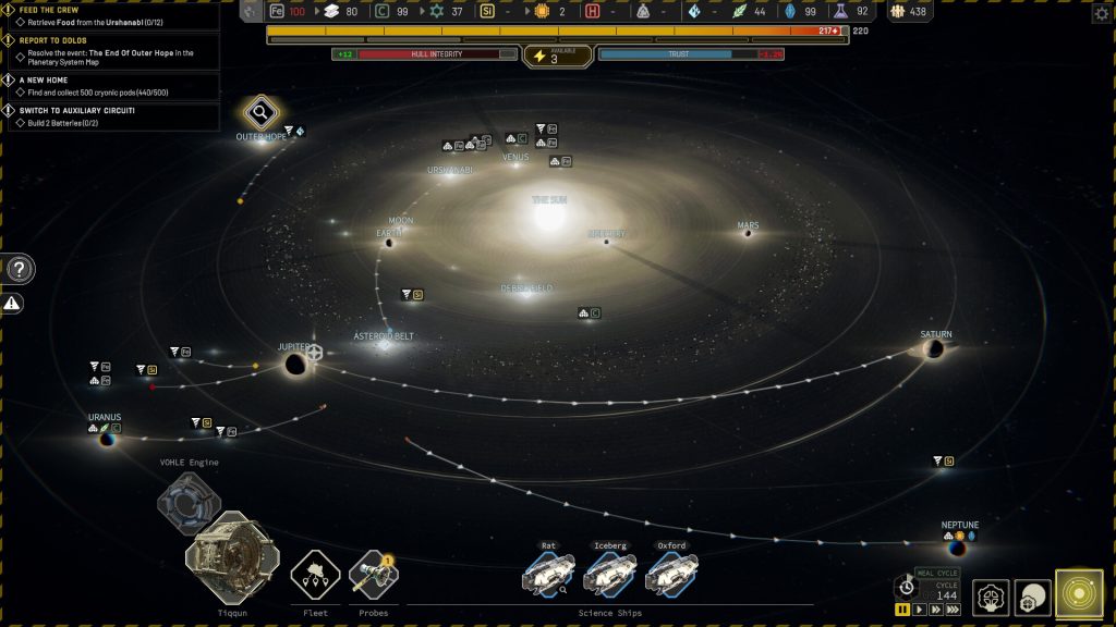Jest trochę oparty na poprzednich grach deweloperów, ale czy Ixion wyróżnia się z tłumu w ciągle zatłoczonej przestrzeni budowniczych miast i przetrwania budowniczych miast? Na szczęście ta gra zdecydowanie ma silną wizję tego, czym chce być. Chociaż wykonanie mogłoby być trochę lepsze. Ixion powala go z parku, jeśli chodzi o to, jak prezentuje się gra. Jego podejście do science fiction jest bardziej ugruntowane. Statek kosmiczny, którym będziesz zarządzał, Tiqqun (wymawiane jak „potentat”) jest niezwykle szczegółowy i ozdobiony drobnymi detalami zarówno na zewnątrz, jak i we wnętrzu. Uwielbiam duże oznakowanie informujące o tym, jaki to sektor. W widoku zewnętrznym brakuje trochę tego, co robi pod względem rozgrywki, ale uwielbiam to, że tam jest. Widok daje poczucie miejsca – gdzie jesteś teraz w Układzie Słonecznym. Możesz więc zobaczyć z bliska planety i wraki miejsca, w którym unosi się Tiqqun. Sprawy stają się tragiczne, a ten widok z zewnątrz pomaga sprzedać to uczucie.