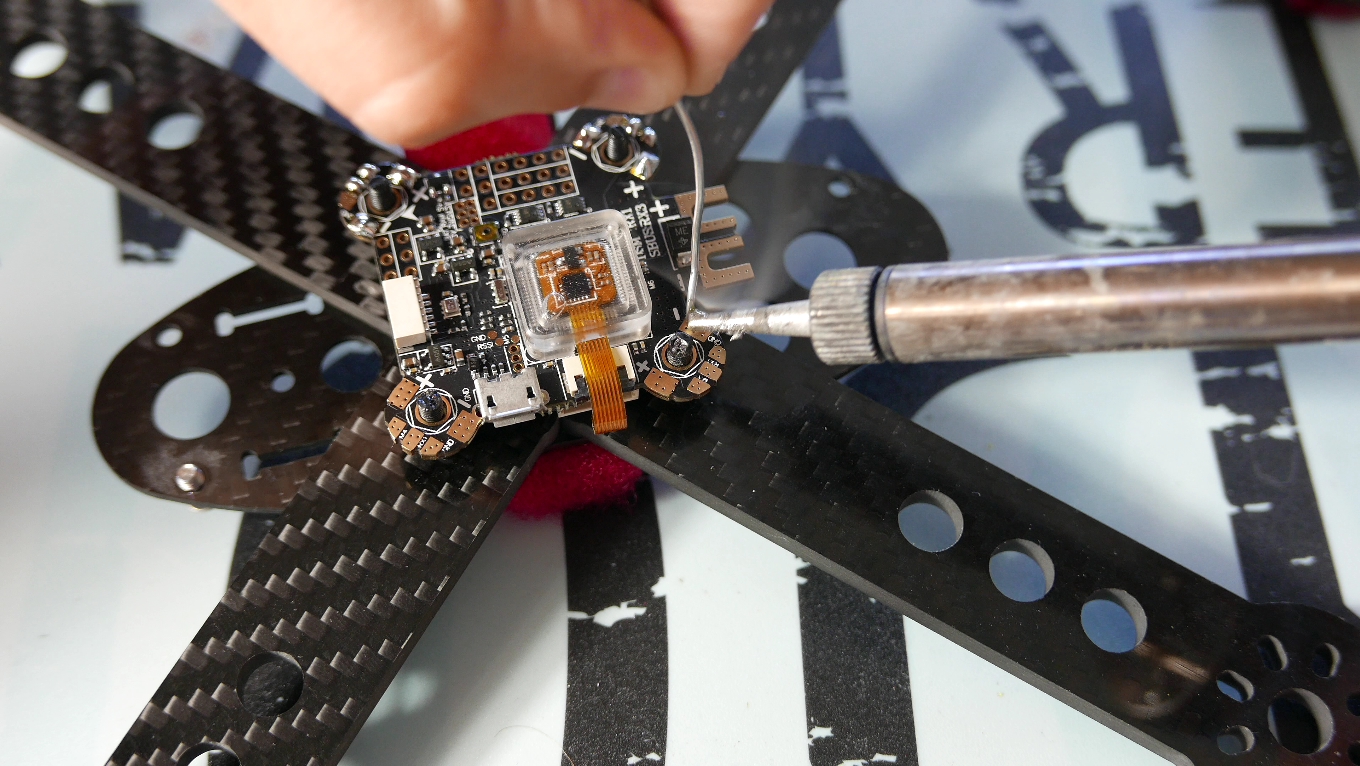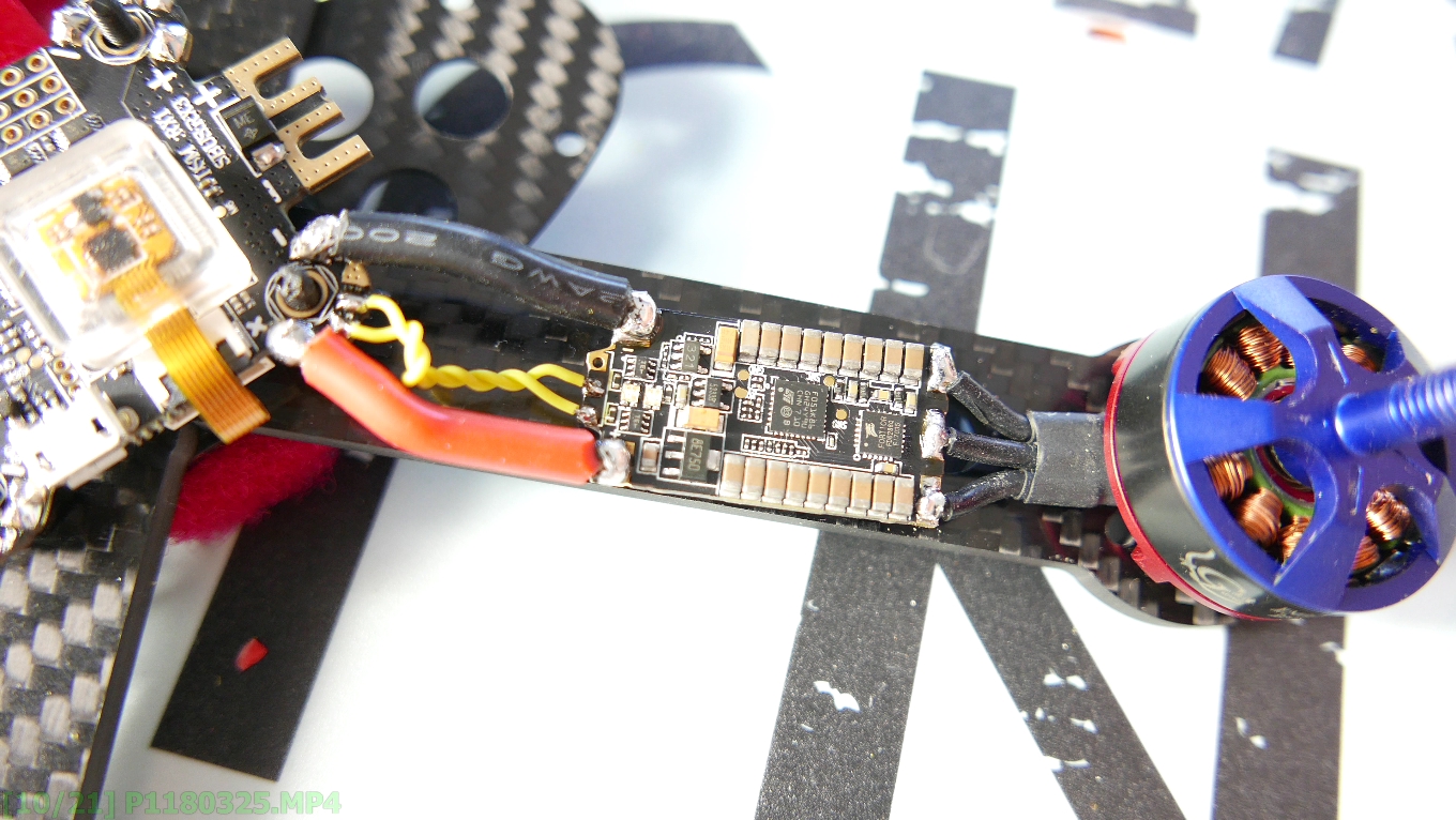 Czas teraz na silniki, poza wizja oczywiscie je odpownie skroliciem po kable mialy ponad 10cm – a taka dlugosc jest tutaj nie potrzebna. Pamietajcie rowniez ze nie ma tak na prawde znaczenia ktory kabel gdzie tutaj przylutujecie bo potem i tak w Blheli bedziecie musieli odwrocic ciag silnikow by kazde sie krecily w odpowiednia strone. No dobra, tak na prawde jedno z czterzech ramion mamy zrobione – teraz by bez sensu nie przedluzac dokladnie to samo powtorze jeszcze 3 razy. I włala powstal nam taki oto pajączek, powiem wam ze wyszlo na prawde ladnie, a luty sa moze nie idealne ale na 5- w moim mniemaniu na pewno zasluguja.