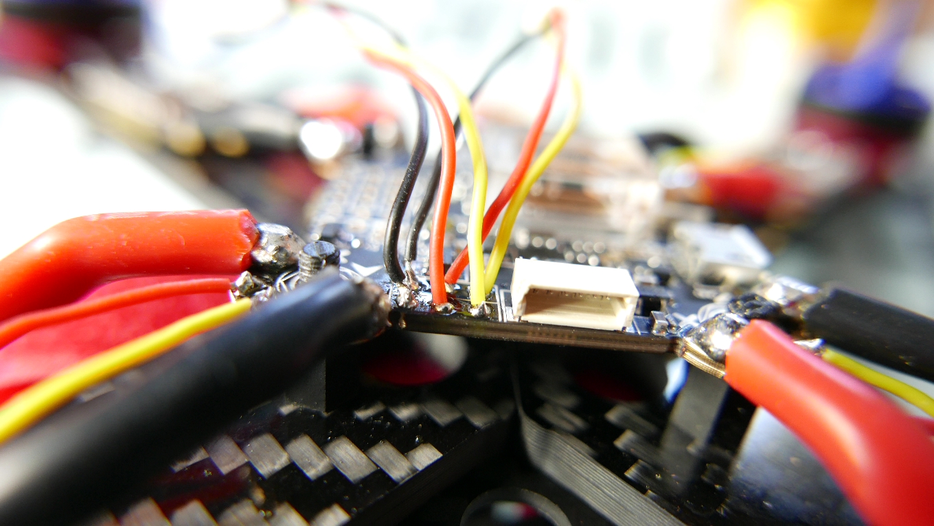 Oki, pady przygotowane czas wziac ESC, tutaj jak widzicie na dole mamy duzego Pada minusowego, idac dalej do malych dziurek jest to kolejny ground, na srodku mamy RX czyli pad od telemetri, nastepnie jest PMW czyli silnik no i duzy plus. Wiedzac to wszystko moge zatem powoli laczyc ESC z FC. Na poczatek przylutujmy sobie kabel AWG 12 – jest to standardowy przewod do tego typu dzialan majacy duza przepustowosc pradu. Okej tutaj wszystko poszlo gladziutko, teraz zostaly nam dwa mniejsze kable od sterowania silnikiem i telemetri, ostatni jest ground – ale tutaj nie ma zadnej potrzeby go instalowac dlatego ja sobie go daruje.