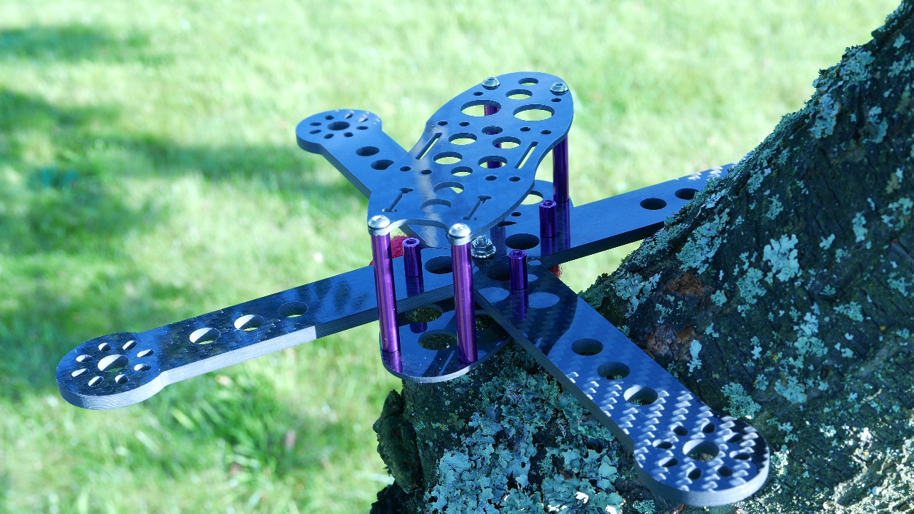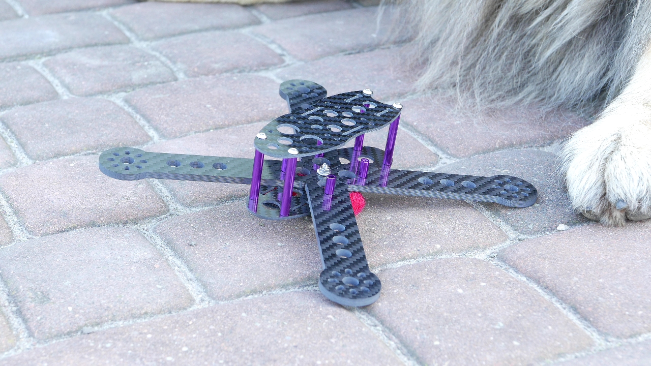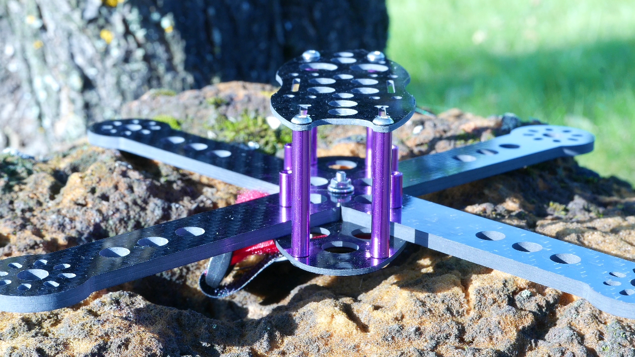 Zacznijmy jednak od początku, rama przyszła do nas w zwykłym kartoniku z drobnymi informacjami byśmy przypadkiem nie pomylili jej z inna przesyłka. W środku oczywiście mamy komplet puzzli do złożenia, min. ramiona ktore maja 4mm grubości zapewniające wytrzymałość przy ewentualnych zderzeniach, te łącza sie z spodem który ma 1.5mm tak samo jak i gorą naszego quada. Słupki w moim egzemplarzu sa koloru fioletowego, ale możemy wybrać jeszcze inna kolorystykę dostępna przez oficjalna dystrybucje. Oczywiście nie zabrakło dodatków jak śrubki czy inne nakrętki i to wszystko. Warto jeszcze zauważyć ze wszystkie elementy są bardzo dobrze wycięte, bez ubytków czy poszczerbionych łuków – co zarówno dowodzi ze firma dba o jakość jak i nie bedizemy mieli problemów by całość złożyć.