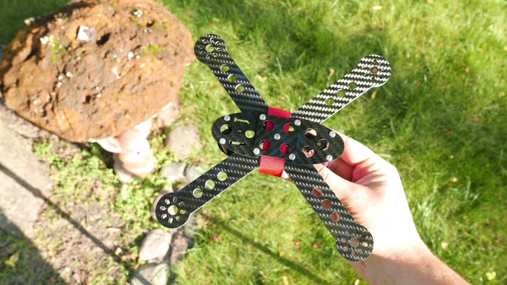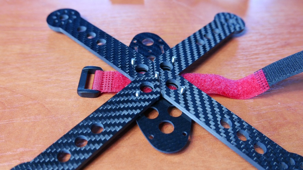 Sama rama po zlozeniu wyglada minimalistycznie i troche jak ser szwajcarski i sa ku temu dwa powodu dlaczego projektaci tak ja wykonali. Pierwszy z nich to redukcja masy, rama zostala wyprodukowana 2 lata temu i na tamte czasy byla to jedna z najlezszych konstrukcji, ba nawet teraz ciezko przebic wage 91 gram. Po drugie podczas lotu przez te dziurki przelatuje powietrze wiec mamy mniejszy opor podczas lotu, co przeklada sie na to ze mamy tak na prawde szybszego drona, nie zmieniajac czesci. Ostatnia ciekawa rzecz w tej ramie to system mocowania rzepu ktory trzyma nasze baterie, tutaj nie ma on zadnych lozow jak np. w moim Martianie dzieki prostemu zabiegowi jakim jest przymocowanie opaski pomiedzy rame i dodatkowo skrecenie jej srubami – proste rozwiazanie i skuteczne. Przelozylem zatem moje bebechy ze starego drona do KC215 i powiem wam ze faktycznie czuc roznice na plus. Quad dzieki temu ze jest lzejszy i bardziej podziurkowany, szybciej osiaga predkosci co np. przy wyscigach jest ogrmna zaletą. Trzeba tez wspomniec o tym ze nawet jak uda nam sie zlamac ramie, to dzieki szybkiemu systemowi demontazu mozemy w chwile polamana czesc zamienic na nowa, wystarczy odkrecic dwie srubki, a nie rozkrecac cala elektronike. Dodatkowo warto zauwazyc ze pomimo dosc ograniczonego miejsca w srodku do ulozenia kontrolera lotu / esc i odbiornika, to spokojnie ja zmiescimy jezeli wszystko przemyslimy.