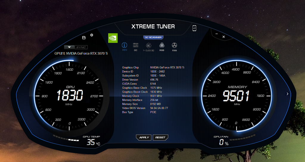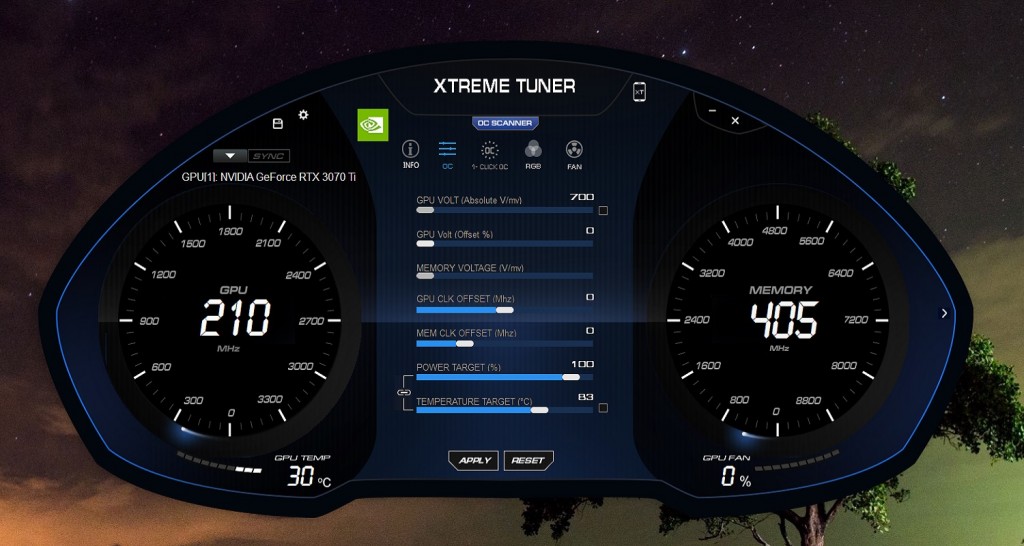 Bardziej zaawansowani użytkownicy często zwiększają częstotliwość. Zwykle, gdy grafika 3D zaczyna pokazywać artefakty, takie jak białe kropki („śnieg”), to znaczy, że przesadziliśmy i trzeba wycofać te np. 25 MHz. Zwykle, gdy przetaktowujemy zbyt mocno, zacznąją się pokazywać artefakty, puste wielokąty lub nawet się wszystko zawiesi. Generalnie teraz to nie wiem po co podkręcać obecną testowaną kartę, ale i tak to pokażemy 😀 Oczywiście pamiętajcie… zawsze podkręcacie na własne ryzyko. My użyliśmy bardzo prostej aplikacji od KFA2 czyli Xtreme tuner.