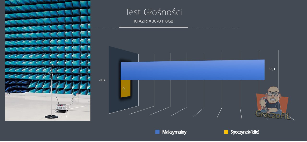 Gdy karty graficzne wytwarzają dużo ciepła, zwykle ciepło to musi być jak najszybciej odprowadzone by nie doszło do przegrzania. Często można zobaczyć masywne aktywne rozwiązania dla fanów, które rzeczywiście mogą pozbyć się ciepła, ale kosztem dodatkowej głośności. Pamiętaj, że test, który wykonujemy, jest niezwykle subiektywny. Kupiliśmy certyfikowany miernik dBA i zaczniemy mierzyć, ile dBA pochodzi z komputera. Dlaczego pytasz to subiektywne? Cóż, w tle zawsze jest hałas, z ulicy, z dysku twardego, wentylatora zasilacza, chłodzenia CPU itp. Tak więc u nas pomiar może lekko sie różnić od tego co Ty będziesz miał w domu. Obiektywny pomiar można było osiągnąć tylko w dźwiękoszczelnej komorze testowej. Ludzki aparat słuchowy ma różną czułość na różnych częstotliwościach. Oznacza to, że percepcja hałasu nie jest w ogóle taka sama dla każdej częstotliwości. Hałas o znaczących zmierzonych poziomach (w dB) przy wysokich lub niskich częstotliwościach nie będzie tak denerwujący, jak gdyby jego energia była skoncentrowana na średnich częstotliwościach. Innymi słowy, zmierzone poziomy hałasu w dB nie będą odzwierciedlać rzeczywistej ludzkiej percepcji głośności hałasu. Dlatego mierzymy poziom dBA. Do miernika poziomu dźwięku dodawany jest specjalny obwód, aby skorygować jego odczyt w odniesieniu do tej koncepcji. Ten odczyt to poziom hałasu w dBA. Litera A jest dodawana, aby wskazać poprawkę dokonaną w pomiarze. Częstotliwości poniżej 1 kHz i powyżej 6 kHz są tłumione, natomiast częstotliwości od 1 kHz do 6 kHz są wzmacniane przez A.