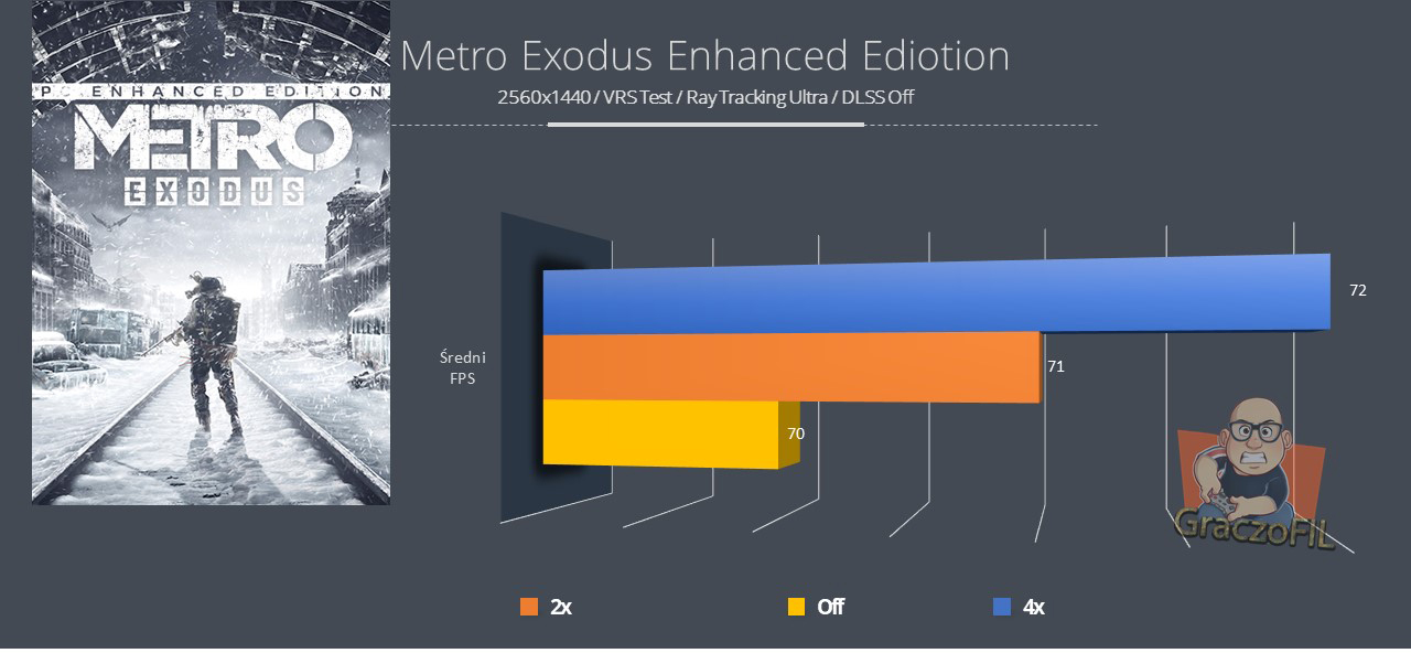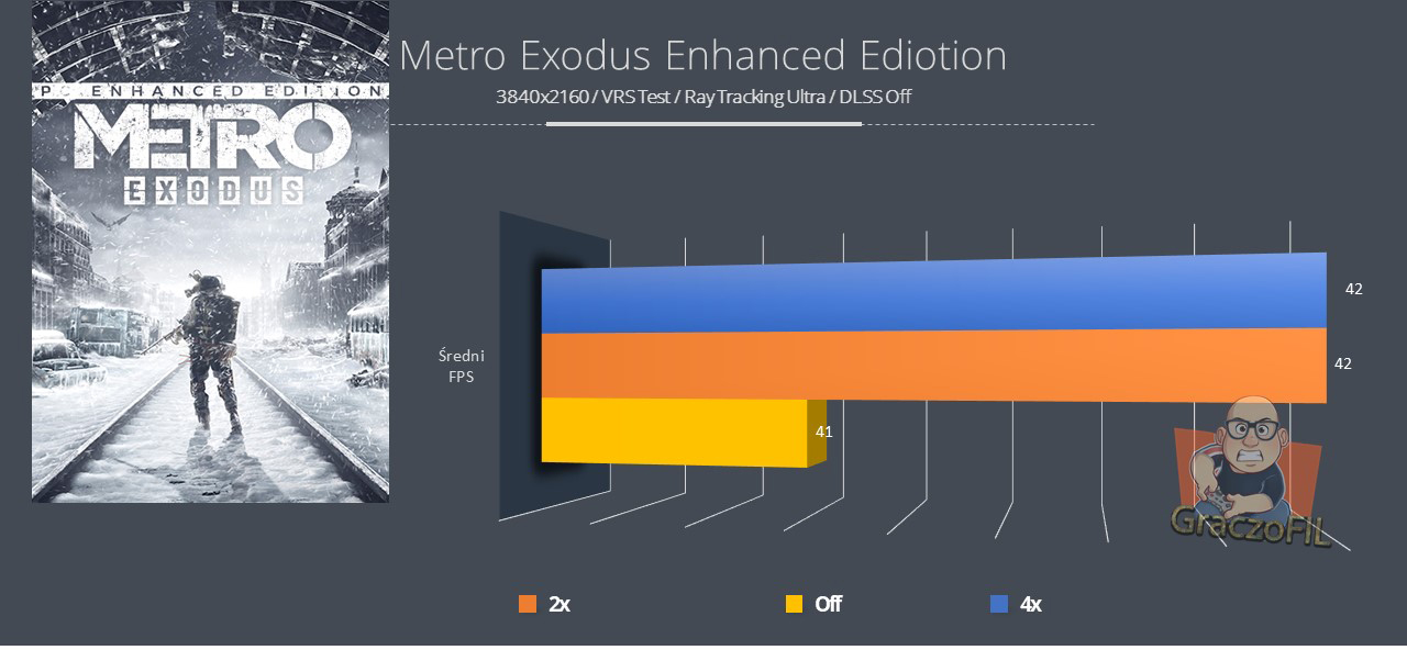 Na pierwszy ogień idzie test Deep Learning Super Sampling (DLSS) od Nvidii, a dzięki tabelce niżej możecie zobaczyć jak kształtują się klatki na sekundę przy różnych opcjach DLSS’u. Ponieważ jest to gra DirectX 12 Ultimate, otrzymujemy również Variable Rate Shading (VRS). Jest to tylko implementacja poziomu 1, co oznacza, że jest bardzo lekka i nie zapewnia zbyt wielu korzyści po włączeniu. I faktycznie poza minimalnym spadkiem fpsów, nie widziałem potrzeby by mieć VRS’a aktywowanego…