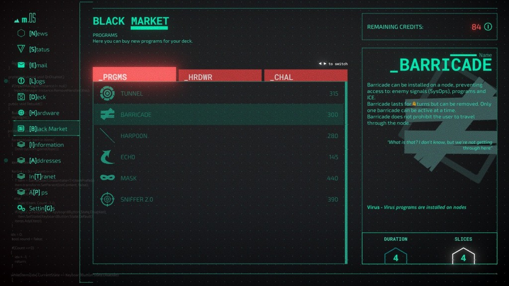 Poza tymi misjami reszta Midnight Protocol istnieje w serii menu, zaprojektowanych do emulacji pulpitu. Duża część historii dzieje się w zakładce E-mail, gdzie komunikujesz się z innymi postaciami, otrzymujesz nowe prace i poznajesz świat. Karta Dzienniki zawiera wszystkie informacje o misji, a następnie możesz zarządzać swoimi programami i sprzętem za pomocą kart Pokład, Sprzęt i Czarny rynek. Właściwie wybierasz misje do rozegrania w zakładce Adresy. Istnieje kilka innych zakładek, ale są to główne, a gra sprawia, że spędzasz w nich trochę za dużo czasu, jak na mój gust. Zwłaszcza jeśli chodzi o historię zawartą w zakładkach E-mail i Dzienniki, gra ma tak dużo tekstu do przeczytania, ale w zasadzie wszystko jest opcjonalne. Po prostu szybko klikałem dialogi, e-maile i logi, aby wrócić do gry, ale spowodowało to pewien problem, ponieważ szybko straciłem wszelkie odniesienia do tego, co dzieje się w grze, przez co misje były abstrakcyjne i trudne do zaangażuj się.