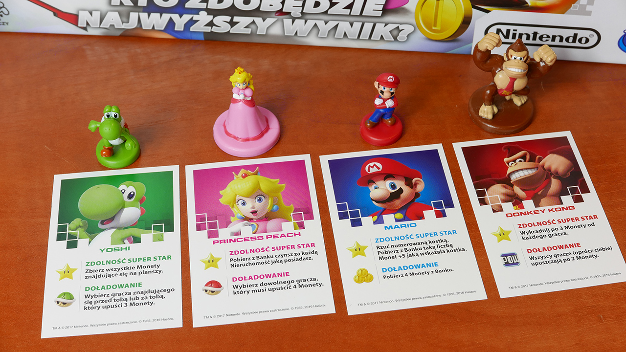 Najnowsza z tych współpracy łączy najbardziej znaną na świecie grę planszową z jedną z najbardziej znanych postaci w kulturze popularnej i grach – Super Mario. Zanim zaczniesz myśleć, że to kolejny szybki skok na kase bo wykorzystują legendardnego Maria to przeczytaj do konca tą recenzje. Bowiem Zamiast po prostu uderzać motywem Mario w istniejącą grę Monopoly, Hasbro naprawdę zastanawiał się, jak podejść do tego wyjątkowego partnerstwa. Podczas gdy czerwony i niebieski hydraulik od Nintendo może znajdować się z przodu i centrum w Monopoly Game Edition, jest też kilka innych znanych twarzy. Dawno minęły nudne stare buty, naparstki i cylinder. Zamiast tego zostają zastąpieni błyszczącymi i dobrze namalowanymi postaciami Nintendo, takimi jak Princess Peach, Yoshi i Donkey Kong. Każda z tych postaci nie tylko wygląda naprawdę dobrze, ale ma swoje unikalne umiejętności. Tak, postaciami którymi będziemy się poruszać mają teraz wyjątkowe moce, które pomagają ci kopać tyłek twojego przeciwnika, a co więcej, każda umiejętność pasuje idealnie tematycznie, na przykład Yoshi może pożreć monety leżące na planszy.