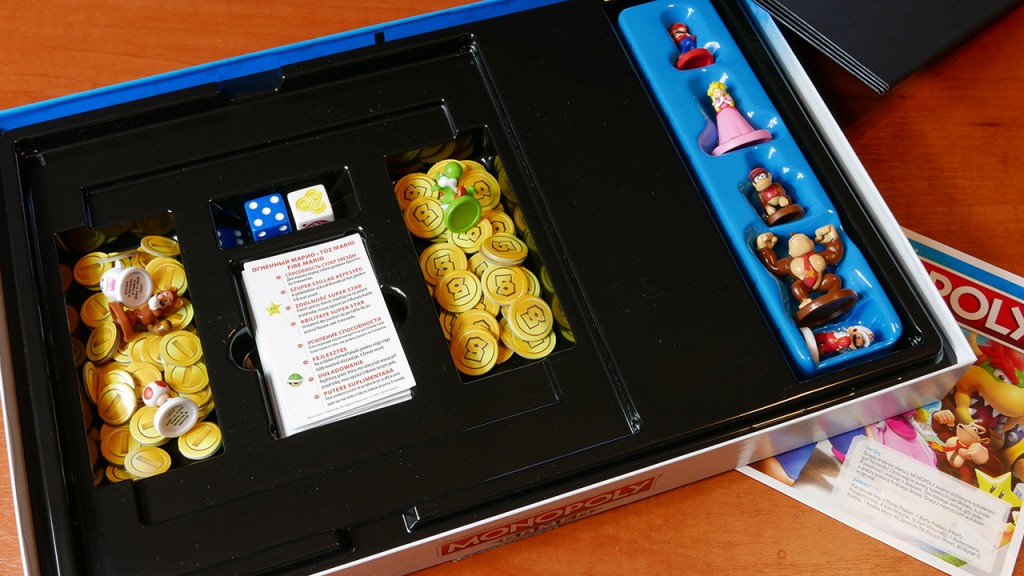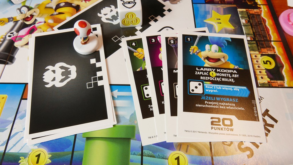 Wszystko to sprowadza się do tego, że gracze będą mieli zasadniczo trzy sposoby na zdobywanie punktów: przez pokonanie bossów, zbieranie monet lub kupowanie nieruchomości. Jest jednak kilka rzeczy, o których należy pamiętać. Punkty uzyskane przez pokonanie bossów nie mogą być przedmiotem handlu, kradzieży ani wykorzystania do spłaty zadłużenia. To oczywiście sprawia, że pokonanie bossów jest bardzo lukratywną opcją, ponieważ zarówno nieruchomości, jak i monety są podatne na kradzieże, transakcje lub mogą być użyte do spłacenia długu. Fajnie też, że poza standardową kostką z oczkami, mamy drugą kość, która daje nam różne wspomagacze jak np. Zieloną skorupę, którą rzucamy w postać przed nami, w efekcie czego upuszcza monety na polu, na którym aktualnie stoi. Czerwoną skorupę, którą rzucamy w dowolnego gracza (i on też z wrażenia upuszcza kasę na planszę). Duszka, który tak przeraża wszystkich (poza nami, bo przecież to nasz zaprzyjaźniony duch), że upuszczają kasę. Czy monety, które pobieramy z banku.To, wraz z rożnymi umiejętnościami postaci, pomaga podnieść klasyczną mechanikę Monopoly z prostej gry typu „przejmij, kup, pobierz haracz” do takiej, która oferuje graczom większy wybór. Co ciekawe Hasbro niczym EA Games dodało DLC do tego. JAK?! Otóż możemy dokupić (fizycznie, w sklepie) dodatkowe postacie jak np. Luigi, Wario, Diddy Kong i Toad. Z jednej strony świetna sprawa, bo każda z nich będzie miała inne umiejętności co wydłuży żywotność samej gry, ale z drugiej… wszyscy nienawidzą płatnych DLC.