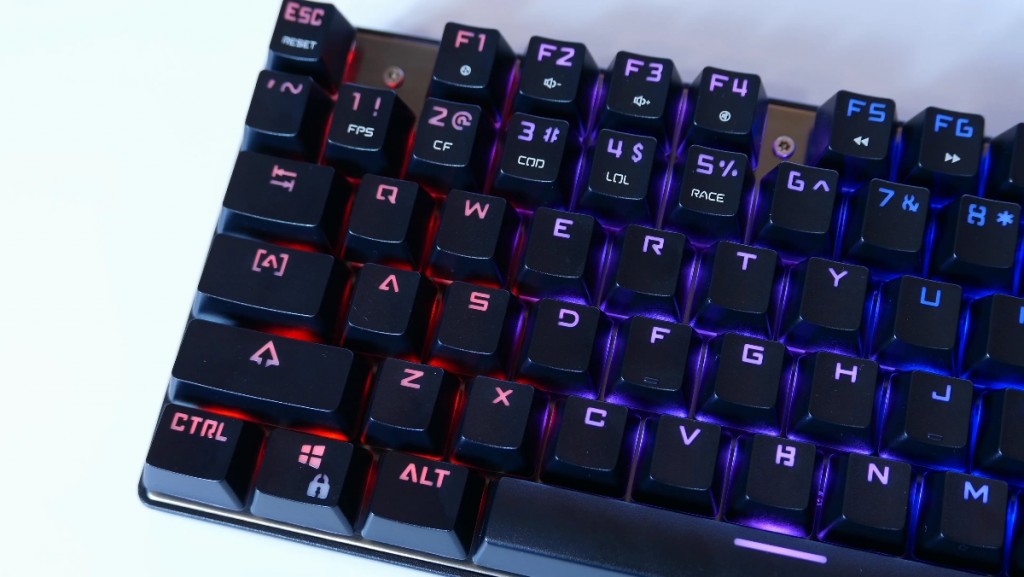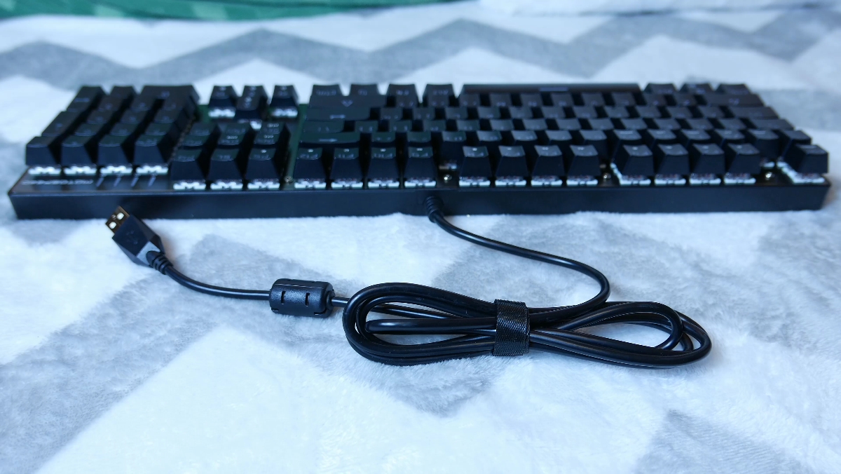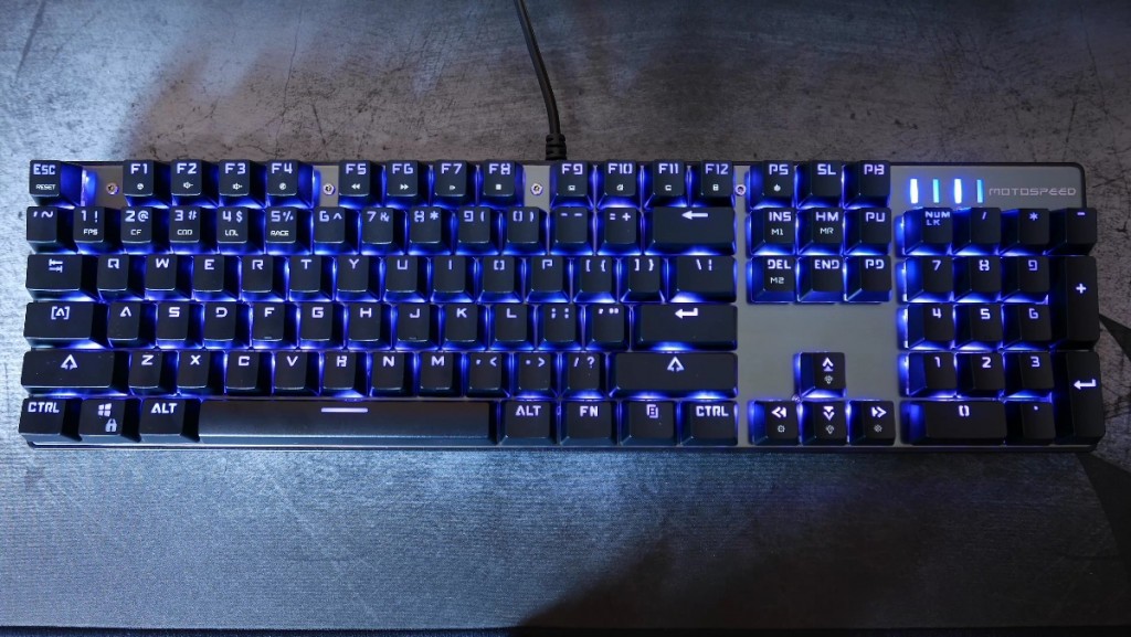Z tylu znalazl sie kabel ktory jest srednio gruby i calkiem elastyczny, nie posiada on natomiast zadnego oplotu ktory moglby wydluzyc jego zycie. CK104 to troche specyficzna klawiatura bowiem jak widzicie jest wąska jak na klawiature pelnowymiarowa jak i krotka a to wszystko dzieki bardzo malym ramkom w okolo. Tutaj Osoby szukające niewielkiej klawiatury mechanicznej z pewnością będą zadowolone, plusem jest rowniez to że wszystkie elementy sa ze soba spasowane wzorowo, a wykorzystane materialy do jej stworzenia sa naprawde dobre.Co ciekawe mamy tutaj rowniez 9 kolorowe podswietlenie ktore mozemy zmieniac w locie. Sa tutaj oczywiscie zainstalowane takie efekty jak rainbow, tylko tutaj calosc przesuwa sie w lewo badz prawo, efekty oddychania, mamy mozliwosc ustawienia jednokolorwego podswietlenia, znalazł sie węzyk czy explozje gdy nacisniemy pewien guzik. Do tego dochodza jeszcze opbcje jasnoci podswietlenia jak i predkosci jego przesuwania. Ale to nie wszystko a to dlatego ze mamy tu możliwość przypisania wybranego koloru do dowolnego klawisza a calosc zaanimowac – wszystko dodatkowo zapisze sie w podrecznej pamieci klawiatury. No i coz musze tutaj stwierdzic fakt ze calosc podswietla sie rownomiernie, swiatlo jest intensywne a barwo ciepla i wyrazista nawet za dnia a to kolejny duzy plus dla motospeeda.