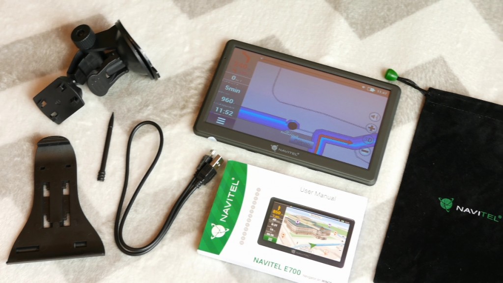 Samo opakowanie to dość gruby karton z którego można wyczytać między innymi to, czym tak naprawdę Navitel wyróżnia sie spośród innych producentów nawigacji, a wiec wraz z zakupem E700 otrzymujemy dostęp do dożywotnich aktualizacji map co kwartał. Samo urządzenie natomiast zostało bardzo dobrze zabezpieczone na czas transportu. W środku znajdziemy między innymi: instrukcje obsługi w aż 13 językach wraz z Polskim, kartę gwarancyjną, ładowarkę samochodową z wtykiem miniUSB, uchwyt do nawigacji z rysikiem, a ostatnim dodatkiem jest zamszowy woreczek z ściągaczami na górze by bezpiecznie przewozić naszą nawigacje.