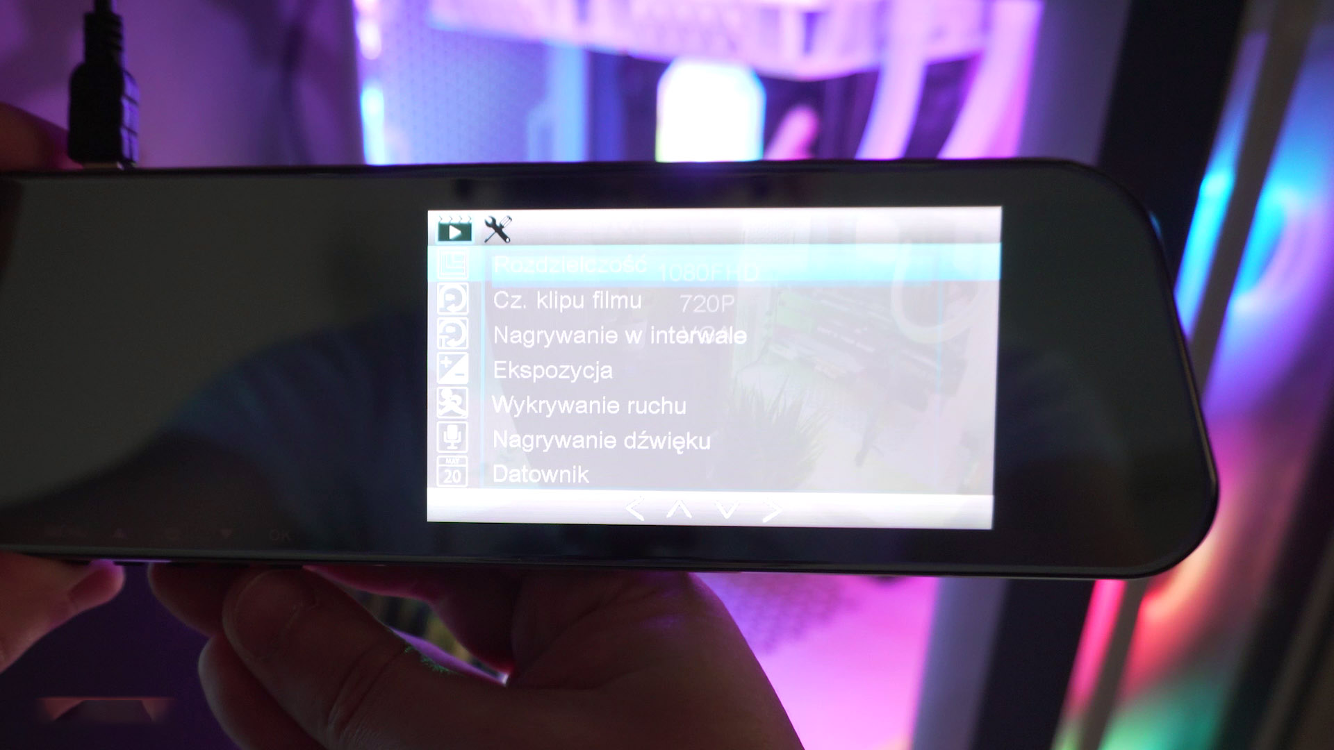 Z przodu jest prawdziwe lustro a po prawej stronie znajduje sie prawie 4.5 calowy wyswietlacz o rozdzielczosci 854х480. Samo poruszanie sie po menu jest extrmalnei latwe, a menu super prste i jedno z najbardziej intuicyjnych na rynku. MR155NV został wyposazony w standardowe funkcje ktore teraz widzicie, a miedzy innymi mamy tu G-sensor, kamerka moze wlaczyc sie gdy wykryje rych czy ustawimy czas klipu filmu. Jedyne czego nie mogłem znalezc to wylaczenie nazwy modelu ktore automatycznie przykleja sie w prawym dolnym rogu.