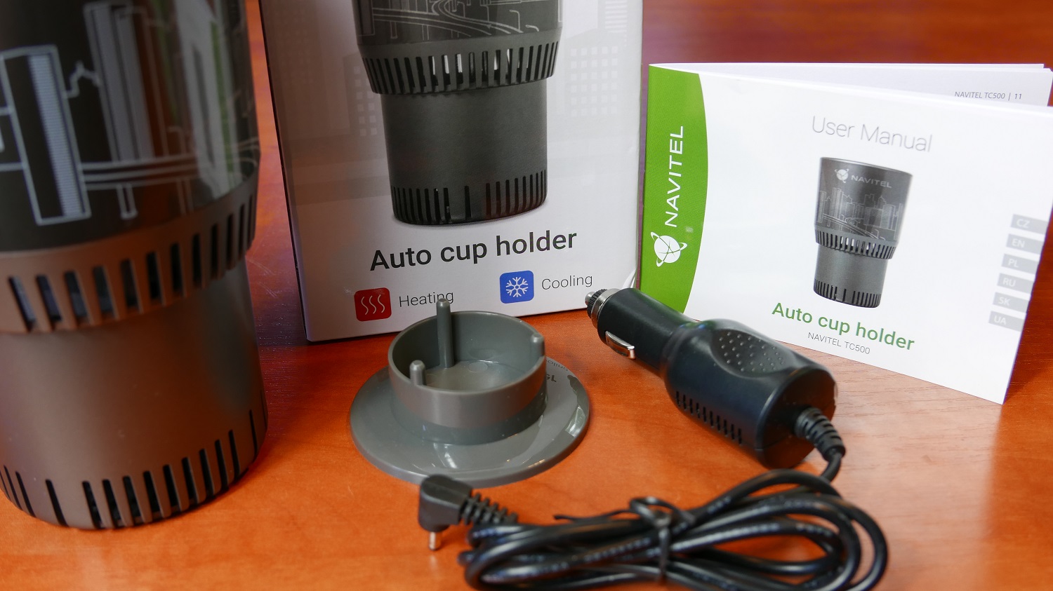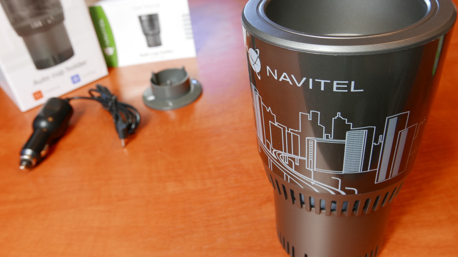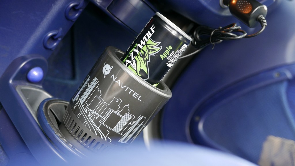 Samo urządzenie jest bardzo dobrze wykonane. Mamy przyzwoitą jakości plastiku jak i aluminium które znajdziemy tam gdzie będziemy umieszczać nasze napoje, bo jak wiemy z lekcji fizyki – aluminium bardzo dobrze przewodzi prąd (w naszym wypadku ciepło i zimno). Na froncie Navitel tez dodał swoje logo + taki szkic miasta. Uchwyt zatem jest minimalistyczny i na pewno w każdym aucie będzie wyglądał bardzo dobrze.