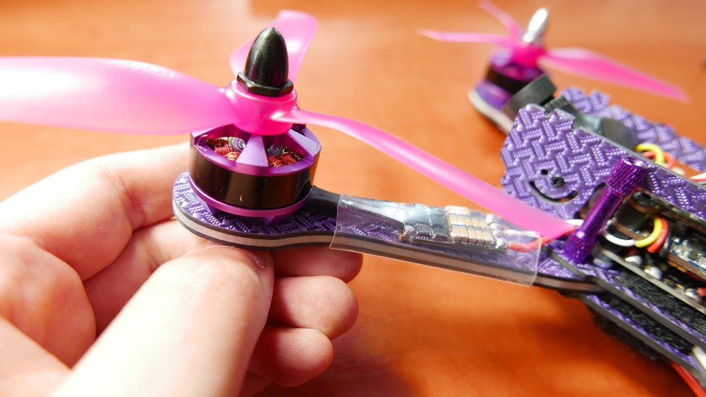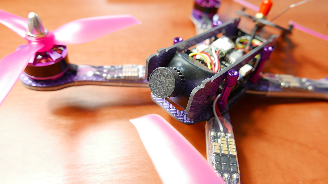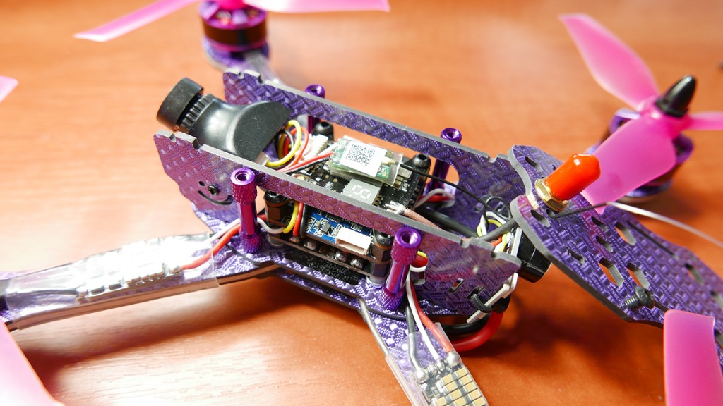 Co mamy w srodku, idac od gory mamy nadajnik Frsky XM i tu pierwsza szkoda bo to nie jestm XM+ ktory moze wyswietlac nam RSSI. Pod spodem mamy VTX’a 40 kanałowego z dwustopionowa mozliwoscia zmiany mocy z 25 na 300mW co spokojnie moze wystarczyc na loty do 2 kilometrów. Pod spodem jest OMNIBUS z procesorem F4 z wbudowanym OSD tak wiec w goglach bedziemy mieli wyswietlony poziom baterii co jak dla mnie jest absolutna koniecznoscia i bardzo fajnie ze to tutaj jest dostepne. Pod spodem mamy PDB no i na ramionach mamy ESC, tutaj producent na stronie w detalach technicznych nie podal jaki protokół one obsluguja i juz wiem czemu, poniewaz sa to dosc stare regle mogace udzwignac jedynie Oneshot 125. Dalej mamy silniki marki niewiadomo jakiej, ale jak wierzyc producentowi sa ta motory wielkosci 2205 i mocy 2600KV, co ciekawe chodza one na prawde bardzo plynnie i mega gladko.