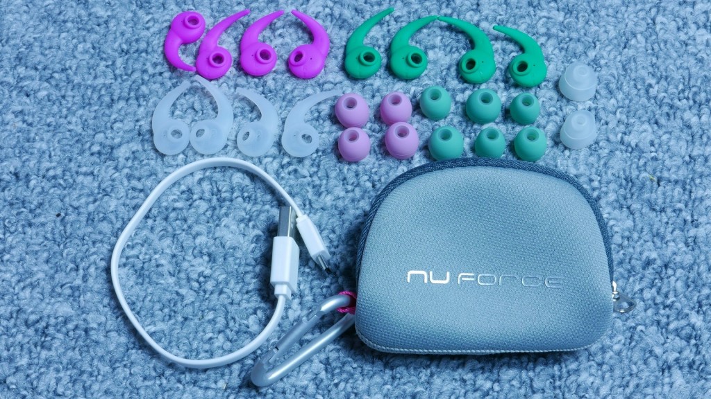 Sprzęt zapakowano w eleganckie twarde białe pudełko, a w środku znajdziemy takie akcesoria jak: miękkie etui wraz z karabińczykiem, słuchawki, 6 par różnych nakładek: silikonowych, z pianki, Spinfit, 4 pary kolorowych skrzydełek i oczywiście kabelek USB. Słuchawki są dość lekkie (ważą 13 gramów), ale jednocześnie metalowe korpusy wyglądają na solidne i wytrzymałe. Podobnie płaski kabel, który uzupełniono o sterownik i mikrofon pozwalający na swobodne korzystanie z funkcji telefonu (gdy źródłem jest smartfon) i obsługę odtwarzacza z poziomu słuchawek. Czas pracy Nuforce wynosi (według informacji producenta) bagatela 10 godziny, a o stanie baterii, poinformuje użytkownika stosowny komunikat.