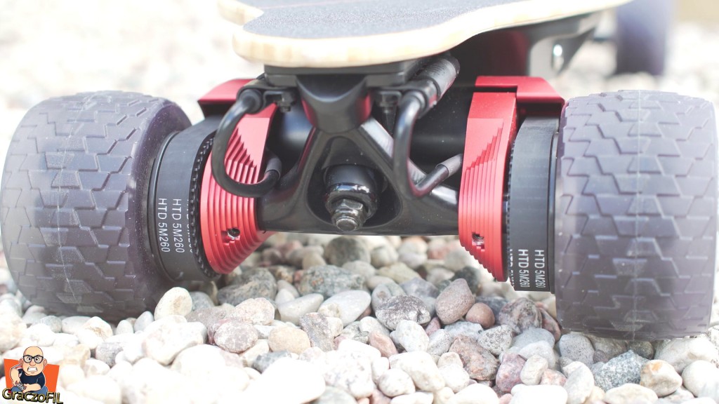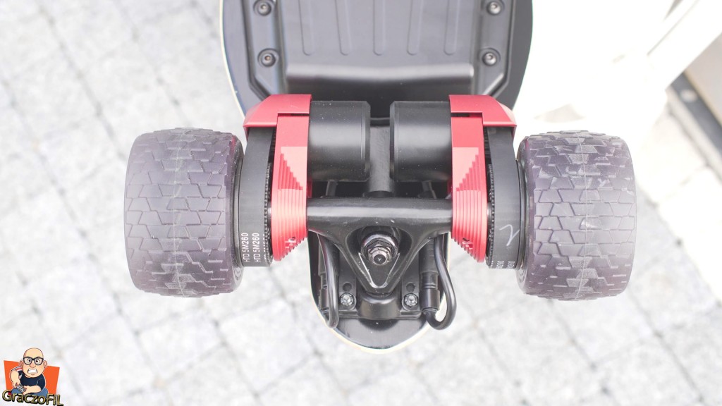 Pod spodem mamy zwykly czarny deck + dwie pokrywy z aluminium a nie plastiku chowajace baterie i elektroike. No i tutaj producent bez watpienia uzył dobrych komponentów, zaczynając od nowego ESC Hobbywingu ktory uwazanay jest w tym momencie za górną półkę. Nie ma tutaj co prawda inteligentnego startu a po prostu guziczkiem wlaczamy deske. Na pochwale zasluguje takze bateria, mocna 12s, 8 Amperogodzinna. Na stronie znajdziemy info ze przejedziemy na niej do 30km a mi sie udalo nabić 31 na jedny ladowaniu, wiec na prawde dobry wynik. Sprzęt napedzany jest przez pasek 5255 i dwa slniki o mocy 750w kazdy – tak wiec mocy bedzie pod dostatkiem. W tym przdziale cenowym trucki dostajemy juz konkretnej firmy, ale tutaj mamy nonajmy – natomiast widze że to jest klon Paris’a z kilkoma usprawnieniami. Jak dla mnmie to nie ma znaczenia czy są one renomowanej firmy, a jak sprawuja sie na drodze i zaraz do tego dojdziemy.