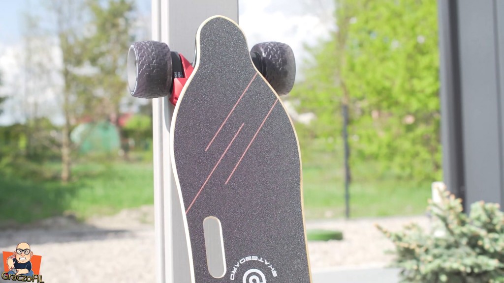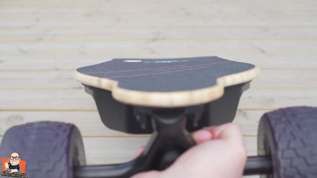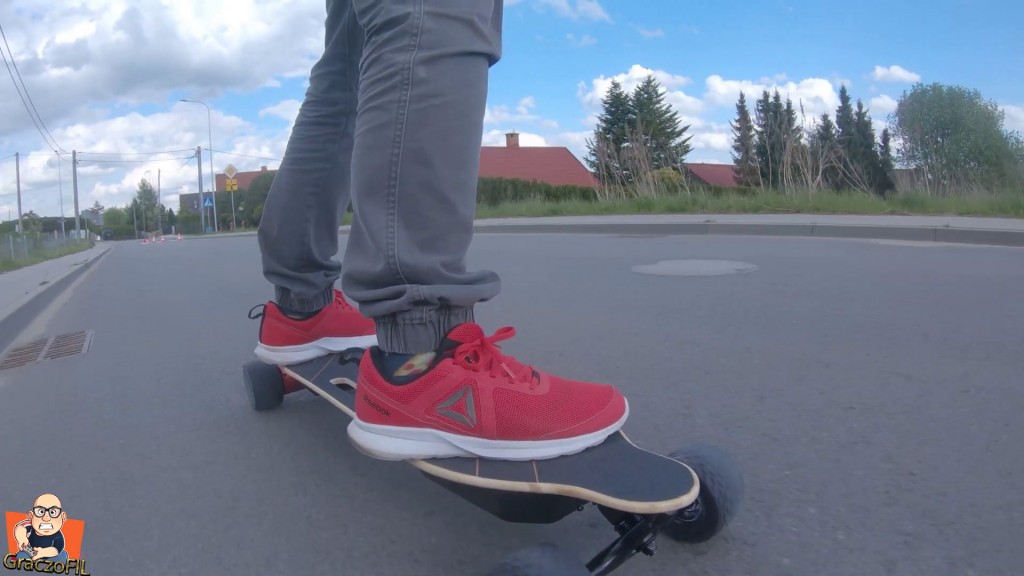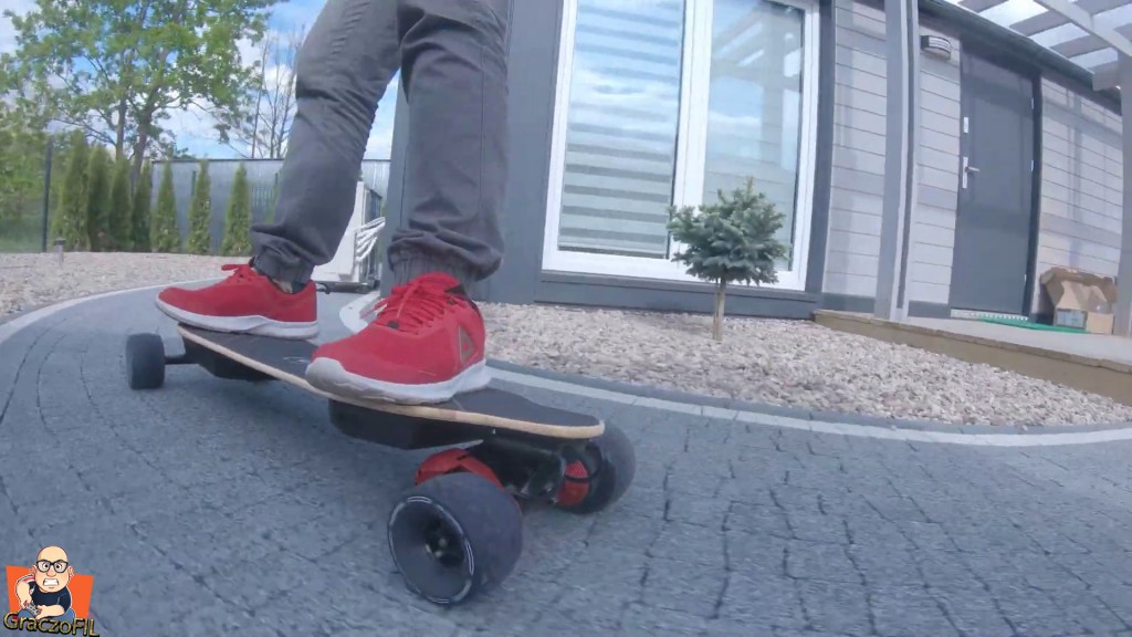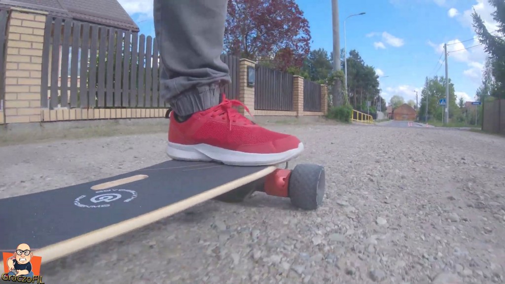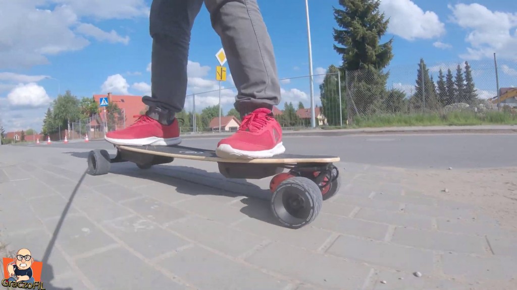 Super ze skrecanie i manewrowanie W2 Pro jest na prawde proste i deska sie nas slucha – responsywnosc jest zatem na wysokim poziomie. Tutaj traki przyszly jak na moj gust zbyt luzne, ale dokrecilem je i teraz jadac szybko deska nie wpada w zadne wibracje i nie boimy sie o wywrotke. Tutaj jedyne co bym pooprawił to krzywizna decka, ta tutaj jest po prostu zbyt minimalna – wieksza na pewno dałaby nam jeszcze wiekszy komfort z jazdy. Koła maja napisane na sobie ze są do kazdego tereonu, i sprawdzilem je w dość slabej i wybistej, kamiennistej drodze. Niestety ale jechalo sie tragicznie – ta deska na cos takiego sie kompletnie nie nadaje. Tzn, wiecie kawałek sie przejedziemy jak musimy, ale wiecej niz 20m to juz mordęga.