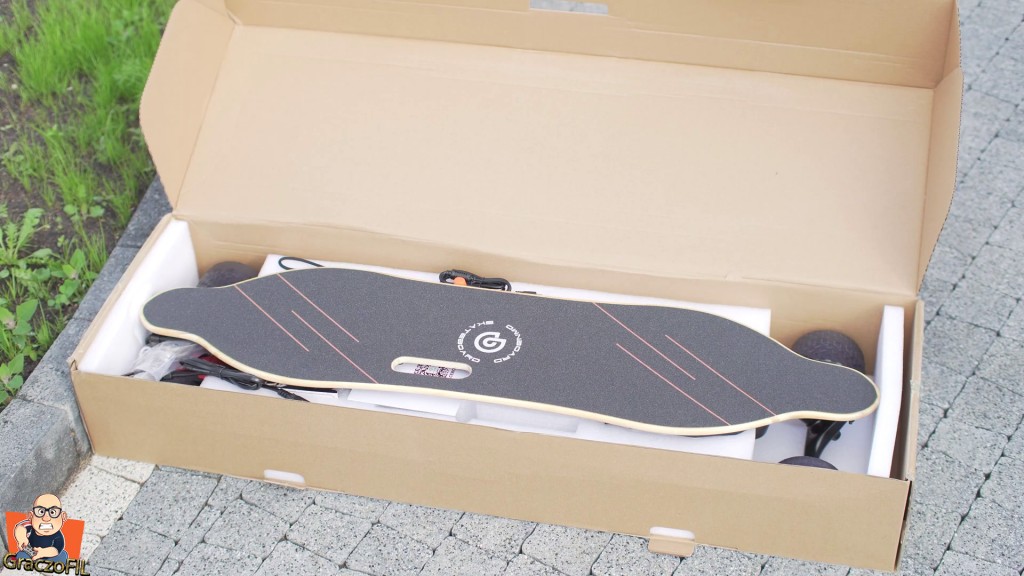 Tak wyglada karton ktory dostaniemy od kuriera, a sam sprzet jest extrmalnie dobrze zabezpieczony na czas transportu, przez mocnia i gruba pianke. W srodku opakowania – znajdziemy ładowarkę, dzieki niej naładujemy deske w 3,5 godziny. Są dwa zapasowe paski, dostaliśmy dość nietypowy imbusik dlugi i krotki w takiej rączce, mamy dosc obszerna instrukcje obslugi ktora zawiera wszystkie aspekty co robić, czego nie i w jaki sposób z deskorolką, otrzymalismy lampke wiec jezeli chcemy byc widoczni mozna sobie ja z tylu zamontowac, Mały zestaw naprawczy w postaci imbusików, srobek, i łozysk + kabelek usb C do ladowania pilota, extra ze w srodku sa dwie twarde gumy z metalową plytka w srodku – taką ochrone decka na pewno docenicie przy jakims uderzeniu. Ostatnim dodatkiem jest T-Tool czyli uniwersalne narzędzie, niezbędne do łatwej regulacji śrub deskorolki.