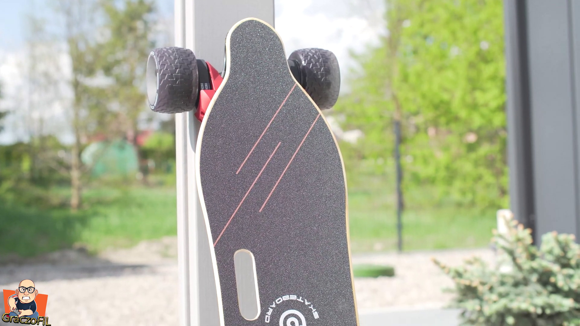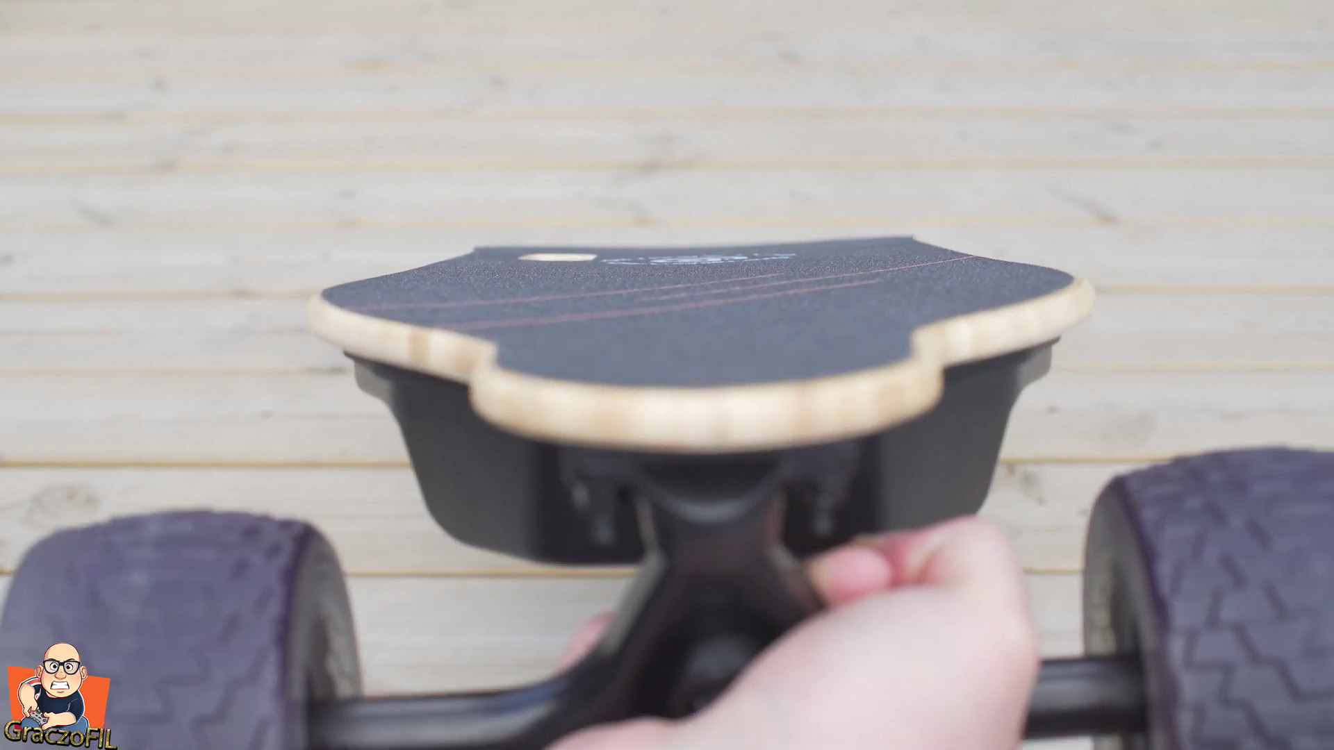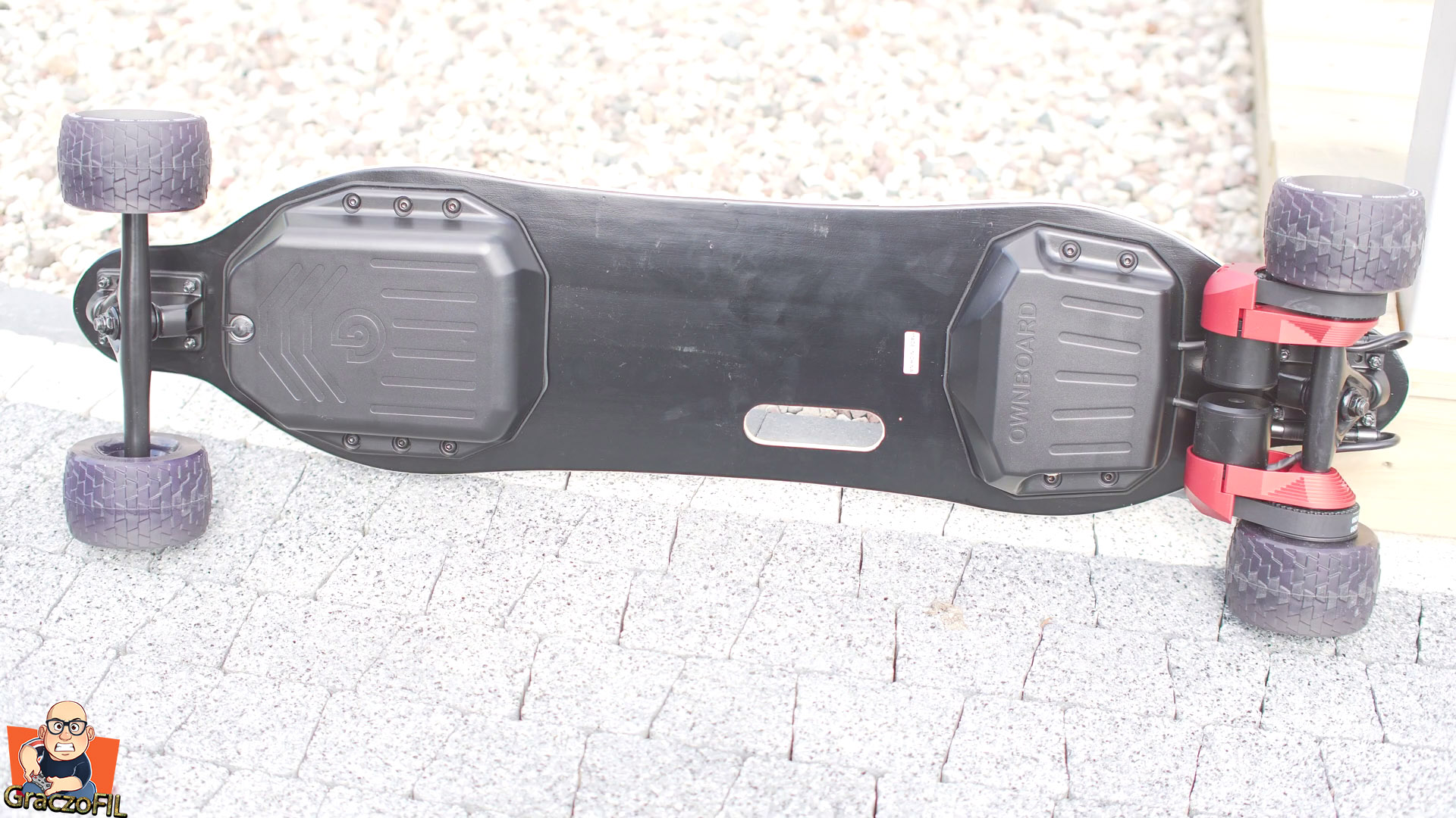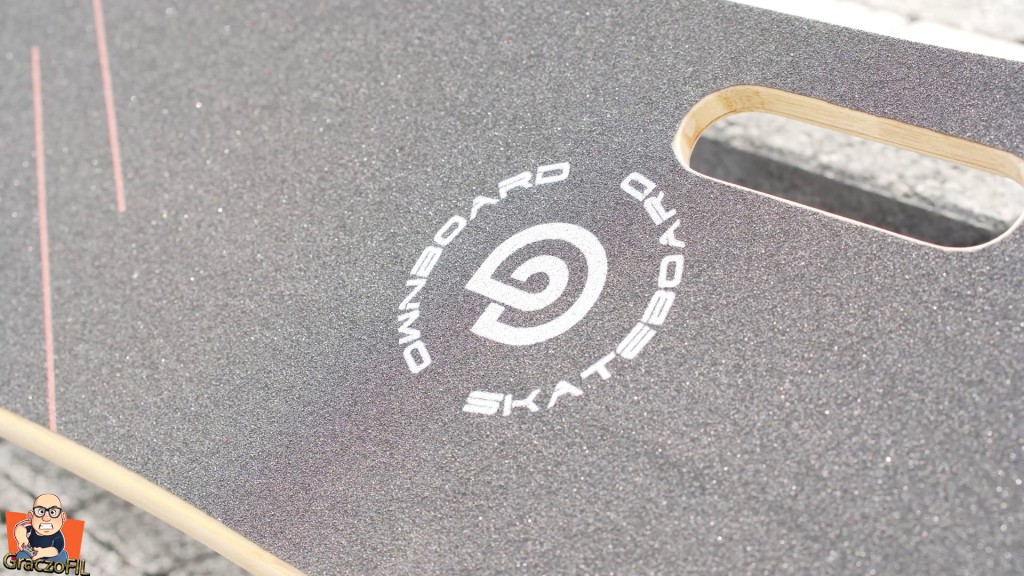 Tak wyglada decha od razu po wyjeciu i od razu czujemy ciezar. Prawie 9kg to nie mało, natomiast zwrocilem uwage na bardzo dobre spasowanie wszystkich elementów. Jezeli chodzi o sam dizajn to jest on bardzo stonowan i minimalny, tutaj Ownboard W2 pro z wyglądu wcale nie krzyczy i nie wyglada, ze jest to sprzet no juz z wyzszej polki cenowej. Deck wygląda na normalny, jednak poza warstwami bambusu w srodku jest wzmiociony jeszcze włóknem szklanym. Jest on bardzo elastyczny a maxymalna waga rajdera ktory moze na desce stac to 120kg. Minimalnie jest równiez wygiety po bokach, a to zawsze docenicie jezeli wczesniej poruszaliscie sie deskorolka bez ergonomii. Na 100% równiez docenicie te koła, 105mm Cloudwheele ktore są nieprzebijalne i posiadaja ceramiczne łozyska. W teorii mają jeszcze absorbowac nierownośći – ale o tym pozniej.