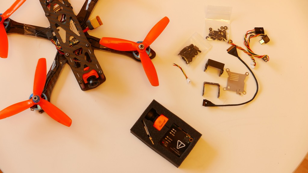 Oczywiście od poczatku, sam produkt jak widzicie jest bardzo dobrze zabezpieczony na czas podrozy a w srodku znajdziemy: instrukcje oblusgi ktora poczatkowo na pewno sie przyda, kartonik z informacja miedzy innymi o tym że mamy rok gwarancji i az 90dniową darmowa wymiane badz naprawde jezeli cos nie dziala. Mamy komplet srub, nakretek i gumek – tutaj milo ze producent dal wiecej niz potrzeba bo takie male elementy lubia sie gubic. Są też oczywiscie kabelki do podlaczenia kamery jak i dodatkowy dluzszy przewod laczacy kamere z plytka drukowana jezeli zamontowany bylby za krotki. Tak wyglada zatem sam produkt, mamy tutaj bowiem tak naprawde 2 w 1 bo nie dosc ze ta kamera generuje obraz identyczny jak Runcam 3 to jest jeszcze naszymi oczami na swiat bo w goglach rowniez widzimy przez to co widzi ta soczewka. Takie rozwiazanie dla mnie jest swietne, bo nie musimy na gorze naszego drona mocowac dodatkowego obciazenia w postaci jakiegos Gopro co przy lekkich konstrukcjach wplywa na czas lotu, a ten jak wiadomo jest na wage zlota. Samo podlaczenie do plytki kontrolu lotu jest banalnie proste, a i warto zaznaczyc ze mozemy kontrolowac niektorymi funkcjami jak wlaczenie nagrywania przez Betaflighta czyli innymi slowy przez nasze radio jak zbindujemy sobie taka funkcje do odpowiedniego przelacznika.
