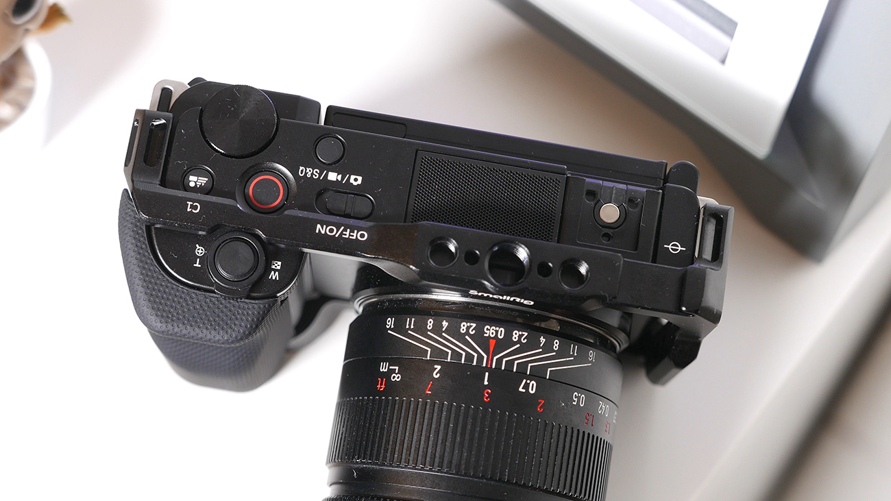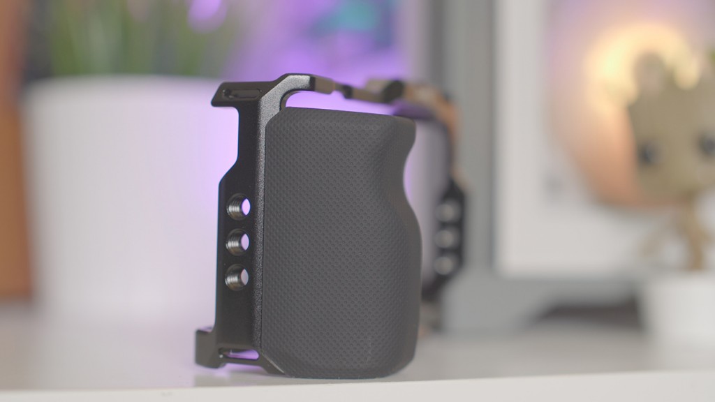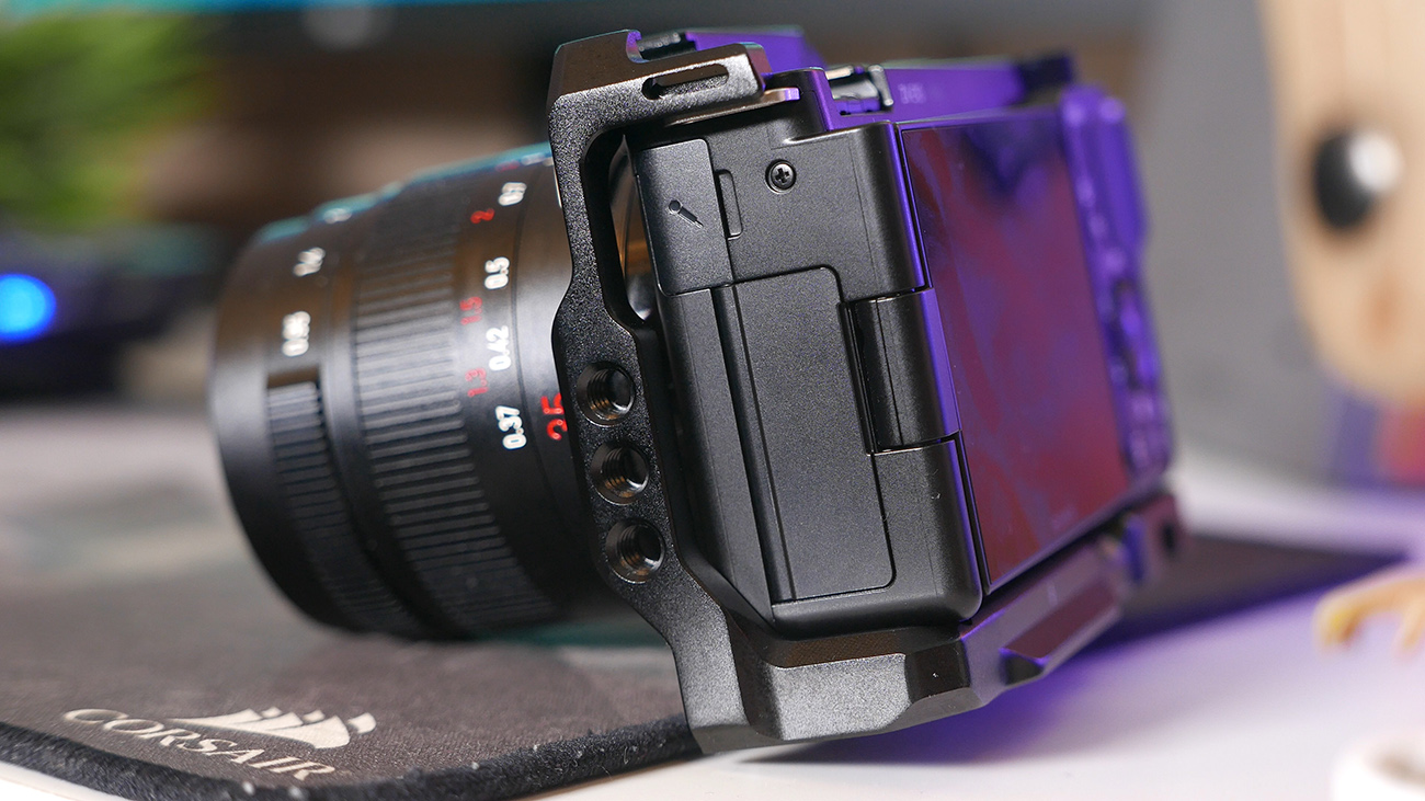 Zalozylem zatem klatke na aparat i musze przyznac ze pasuje co do milimetra, spasowanie jej z ZV-e10 poprostu nie moze byc lepsze co powiiniscie wlasnie widziec na ekranie. Konstrukcja w kazdym calu jest przemyslana, nie blokuje dostepu do zadnego z otworów, czy przyciskow. Dodatkowo jak zobaczycie ze klapka otwiera sie doslownie na wlos od srob ktore trzymaja gumowa rączke no to powinniscie byc pod wrazeniem jak i ja – ktokolwiek to zaprojektowal i wykonal powinien dostac podwyzke.