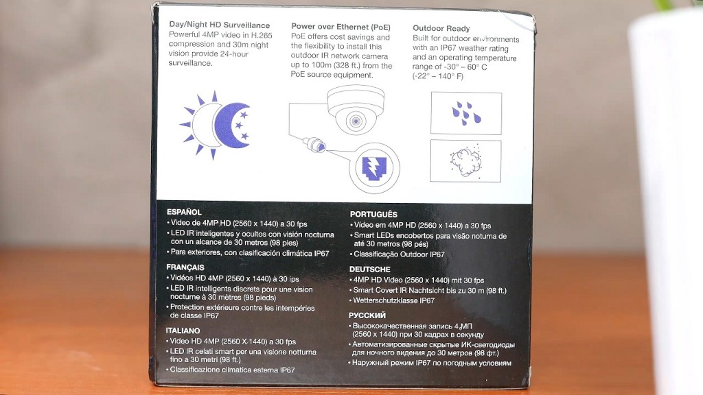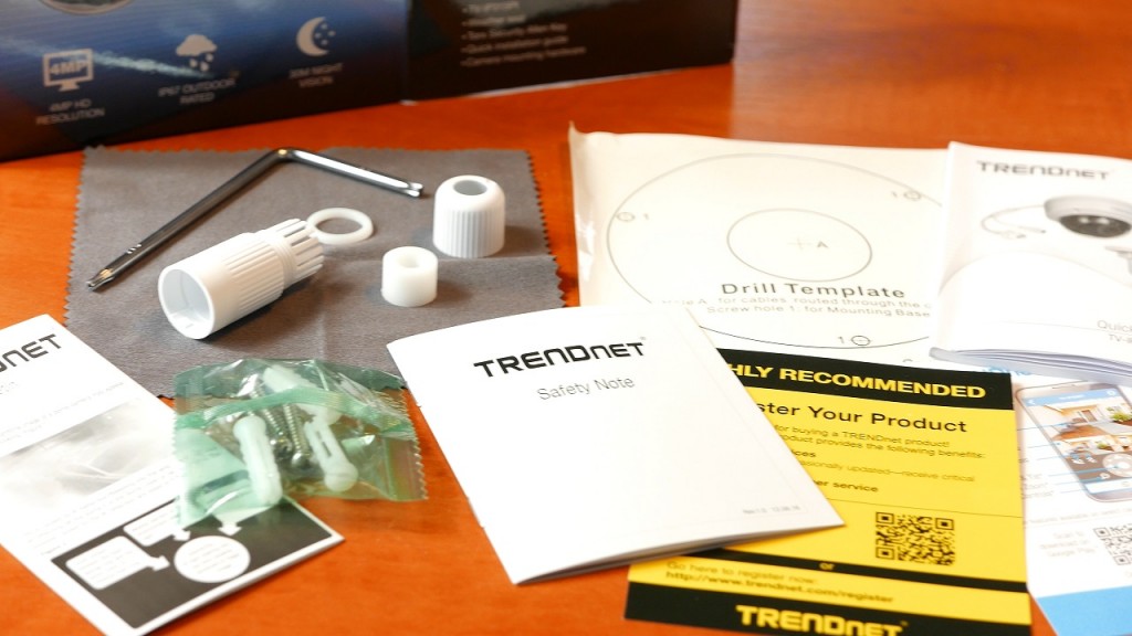 Z przodu dowiemy sie kilku informacji jak to, ze urzadzenie ma rozdzielczosc 4MP i w nocy widocznosc nawet do 30m i to z tyłu oczywiscie mamy wiecej detali technicznych. Sama kamera jest bardzo dobrze zabezpieczone na czas transportu w wycietym kartonie. Poza oczywiscie głownym rejestratorem otrzymuje w zestawie instrukcje obslugi, ta poczatkowo na pewno nam sie przyda i na szczescie jest prosto i przejzyscie napisana. Co ciekawe jak będzie nam parowała kamera otrzymujemy kilka technicznych porad jak to wyeliminować. Jako że kamere mocujemy do sciany czy sufitu to producent dał nam taki szkic gdzie dokladnie mamy wywiecric dziury. To są oczywiscie nasze sruby, mamy tez imbus, sciereczke z mikrofibry by wytrzec obiektyw, i kompet nasadek na kabel by ten był odporny na warunki pogodowe. Dostajemy wiec kompletny zestaw, jedynie szkoda ze nie ma tutaj kabla Ethernet, ten musimy oddzielnie dokupic.