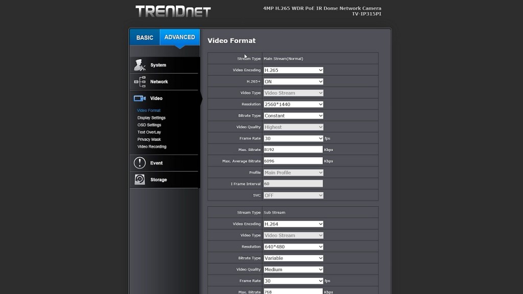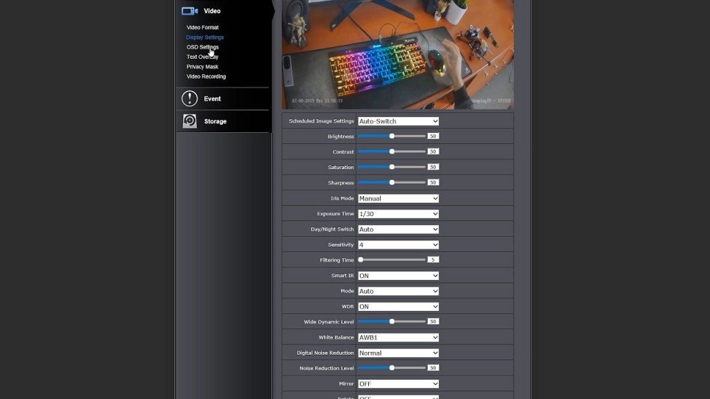 Samo ustawienie kamery jest banalnie proste, wystarczy ze podlaczymy ja do np. naszego laptopa kablem ethernet i po wpisaniu odpowiedniego IP w przegladarke, będziemy mieli dostep do wszystkich funkcji kamery ktorych tutaj jest cala masa. W zakładce Basic mamy podstawowe funkcje jak zrobienie zdjecia, wlaczenie nagrywania, zoom, czy przelaczenie na druga rozdzielczosc jezeli mamy slabszego neta. Tutaj tak na prawde wazne jest jest jedynie PLayback ale o nim nieco pozniej. To w Advenced mamy dopiero ustawienia za ktore zaplacilismy, i tak zaczynajac od Video. Mamy głowne nagrywanie i mozwliosc ustawienia dwoch kodeków H.265 i H.264, rozdzielczosc maksymalna to QHD z pełnymi 30 klatkami na sekunde. Maxymalny bitrate to 16 tysiecy, wiec jakosc powinna byc na prawde dobra – aczkolwiek jak z racji ograniczonego miejsca bede pokazywał wam jakosc z 8 tysiecy. Idac dalej, mozemy ustawic expozycje, wlaczyc albo wylaczyc WDR, jest redukcja szumów, suwaki od saturacji, kontrastu, ostrosci czy jasnosci. Mamy mozliwosc dodania naszego napisu na ekranie czy daty, no i jest obszerny no ja to nazwalem – kalandarz, w ktorym ustawiamy kiedy ma kamera dzialac i tak ja ustawilem by nagrywala non stop. Jednak mozemy zaplanowac w jaki dzien od ktorej do ktorej ma nagrywac, czy ma wlaczyc sie gdy wykryje ruch, czy moze gdy beda jakies wstrzasy – jest na prawde tego duzo.
