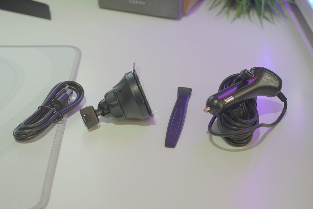 Tak wygląda przód opakowania i tam poza głównym zdjęciem sprzętu nie uświadczymy więcej, to z tyłu producent umieścił więcej detali jak np. to ze kamerka potrafi nagrywać w 120kl/s. Produkt jest dobrze zabezpieczona na czas podroży przez taką twarda gąbczastą formę która okala video rejestrator. W środku zaś znajdziemy: Przyssawkę na szybę z mechanizmem 360stopni wiec sobie odpowiednio kamerę skierujemy, kabelek usb i na prawdę długi kabel USB z wtyczka do gniazda popielniczki – ta długość przewodu spokojnie wystarczy do każdego auta czy busa. Ostatnim dodatkiem to taka „szpachelka” do podważania plastików, by przewody ładnie ułożyć.